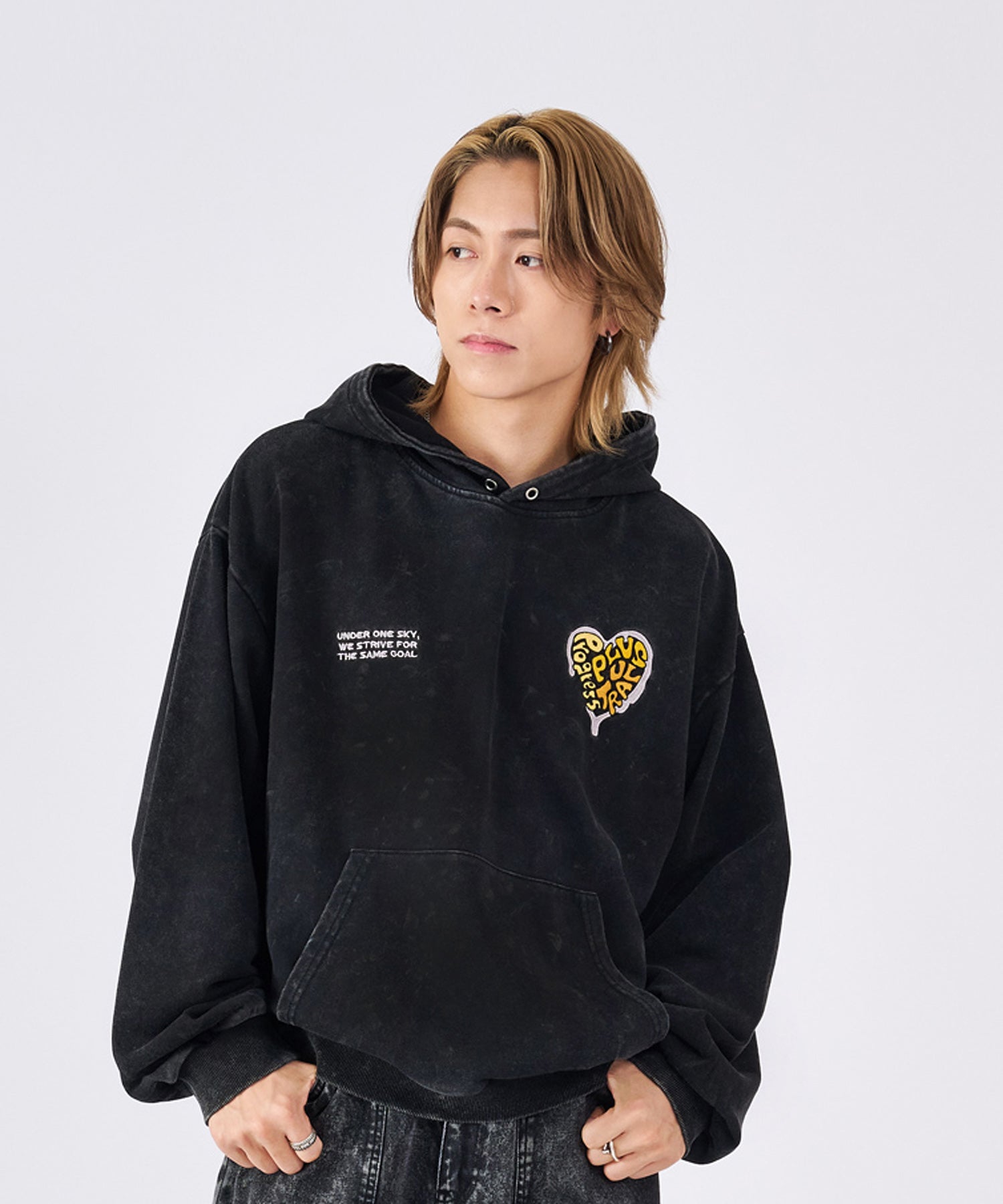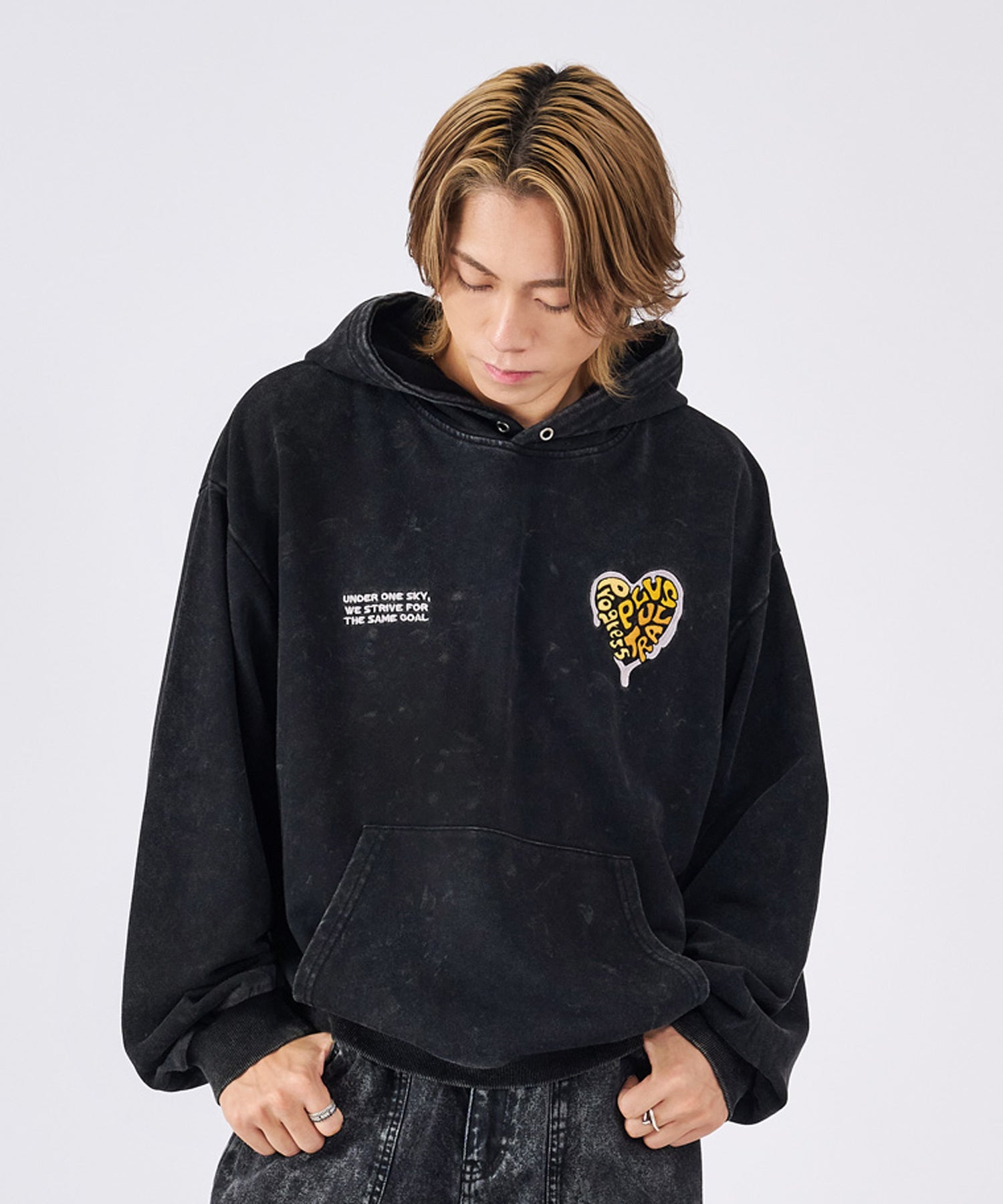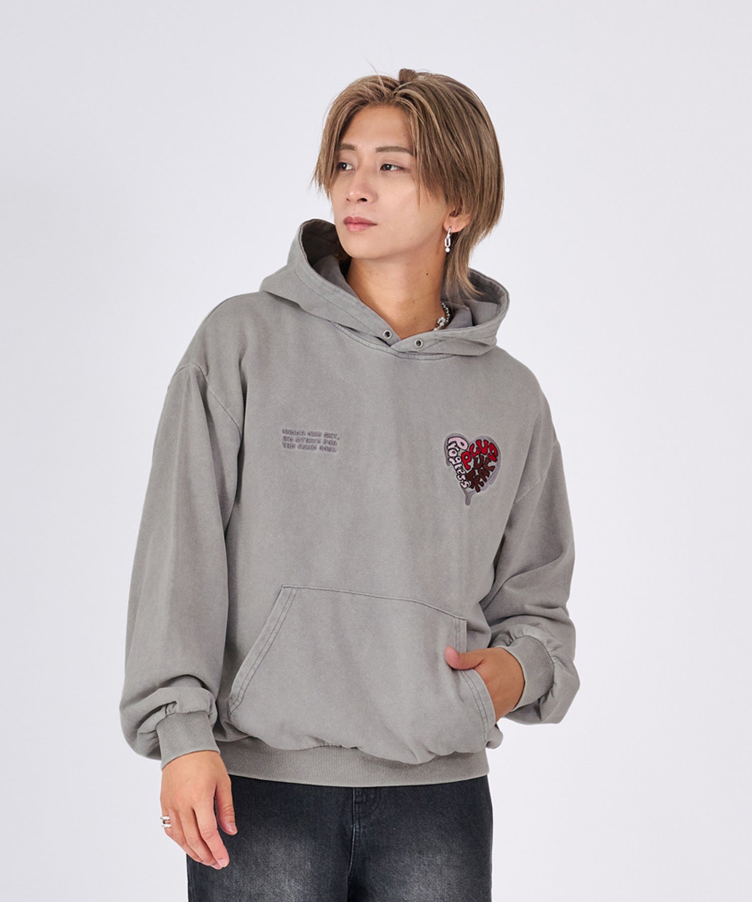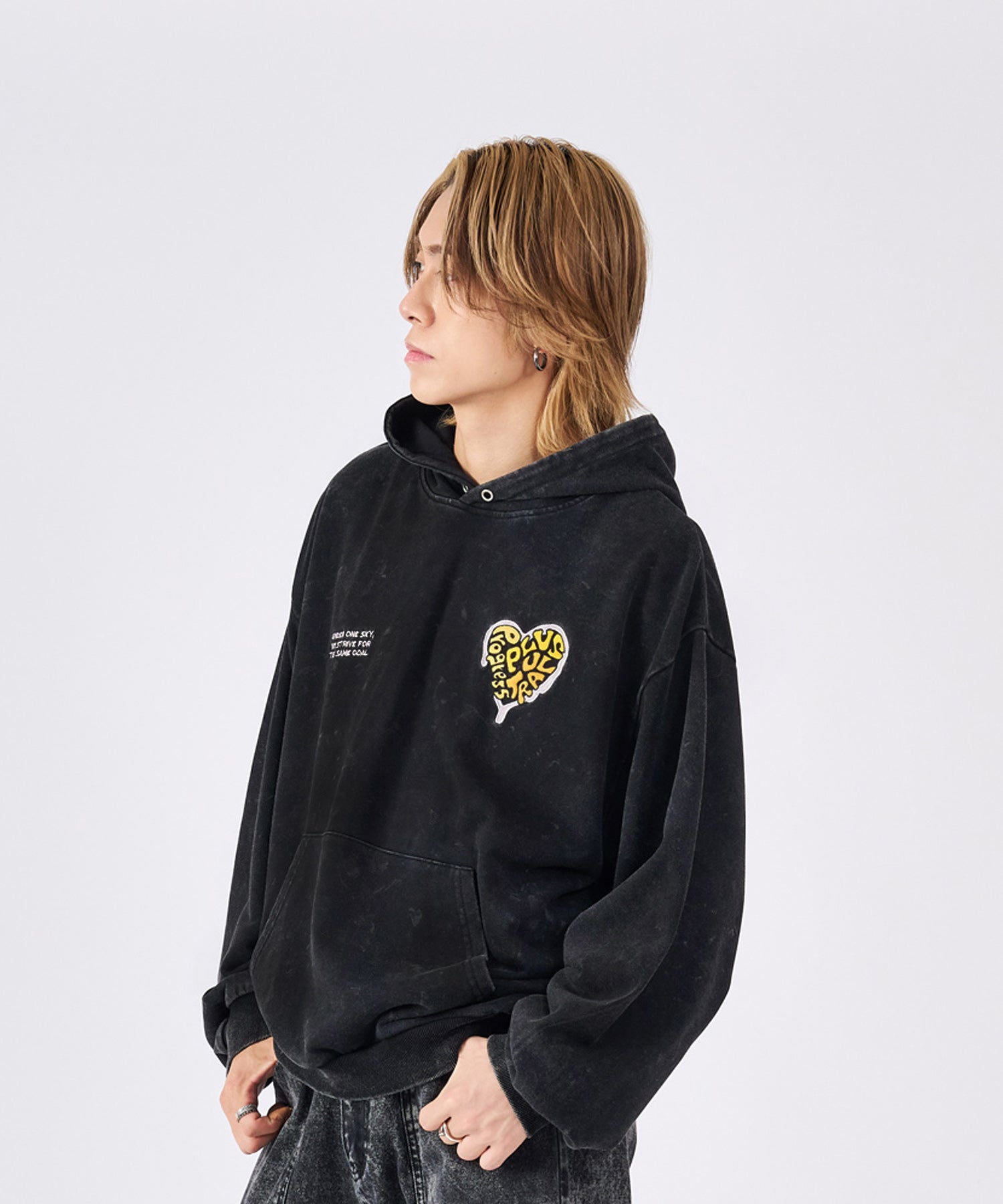 背中と胸のハート柄が人気のプルパーカー❤ハート柄になっているロゴは、カラーがグラデーションになっていて可愛い❤フロントにはポケットを設けたプルパーカーの定番的デザインなのでコーデにも合わせやすい♪