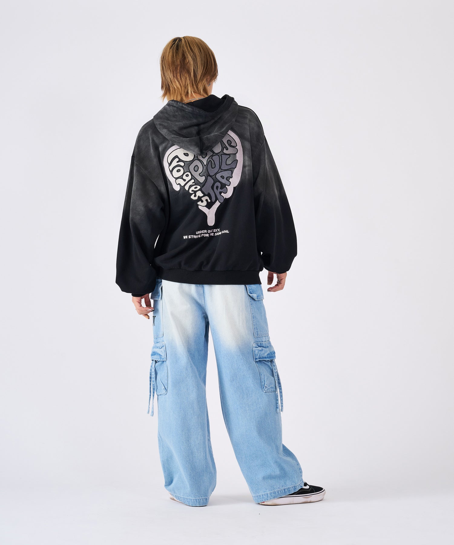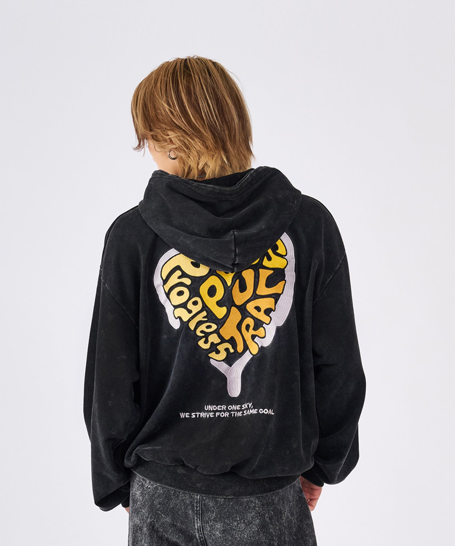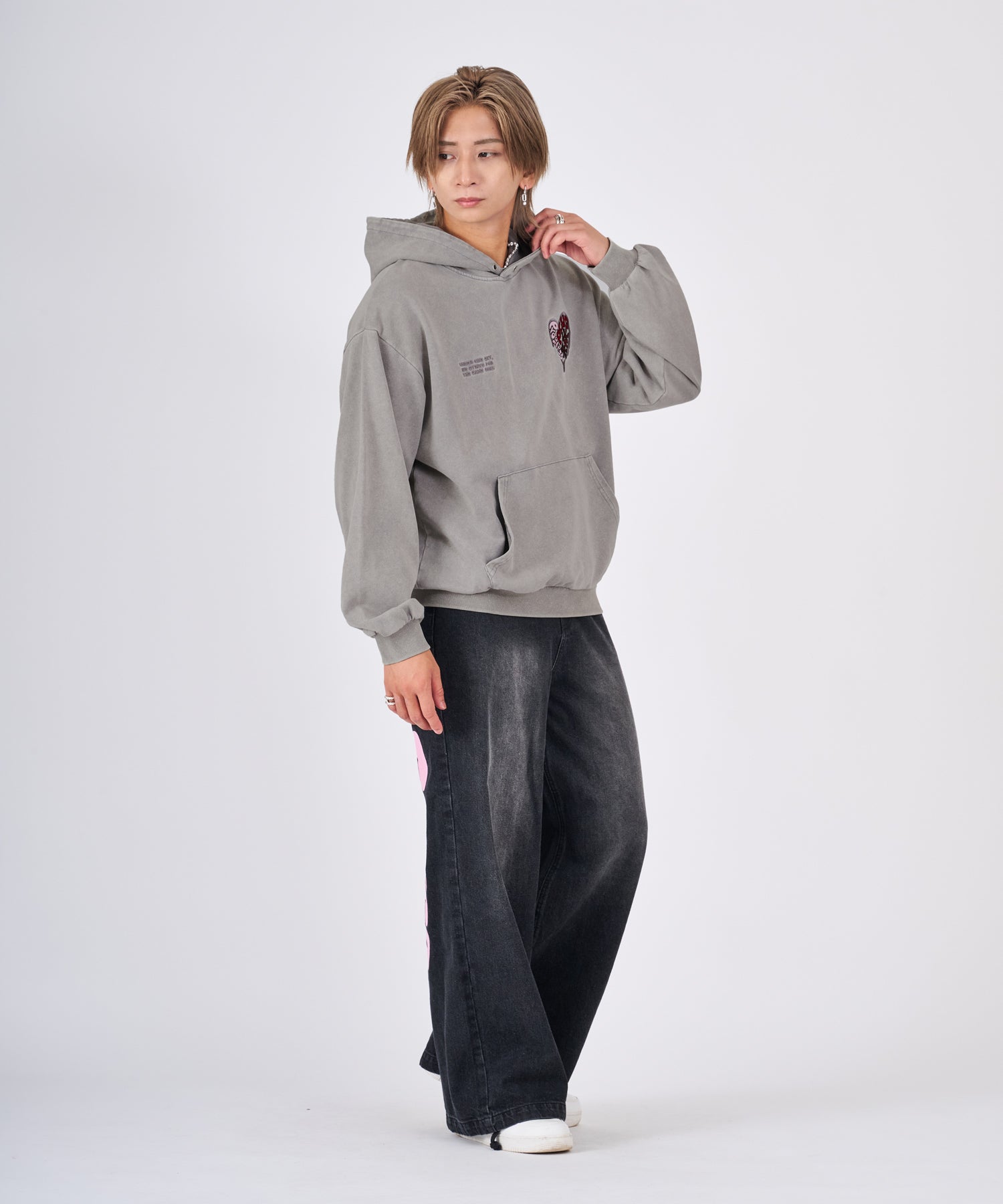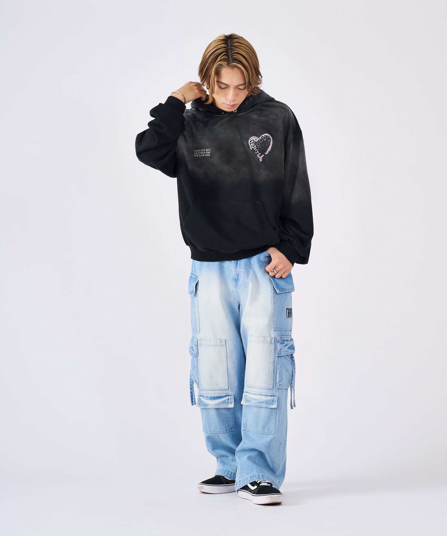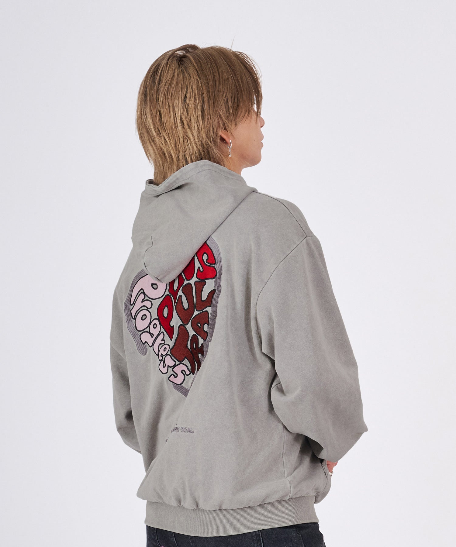 背中と胸のハート柄が人気のプルパーカー❤ハート柄になっているロゴは、カラーがグラデーションになっていて可愛い❤フロントにはポケットを設けたプルパーカーの定番的デザインなのでコーデにも合わせやすい♪