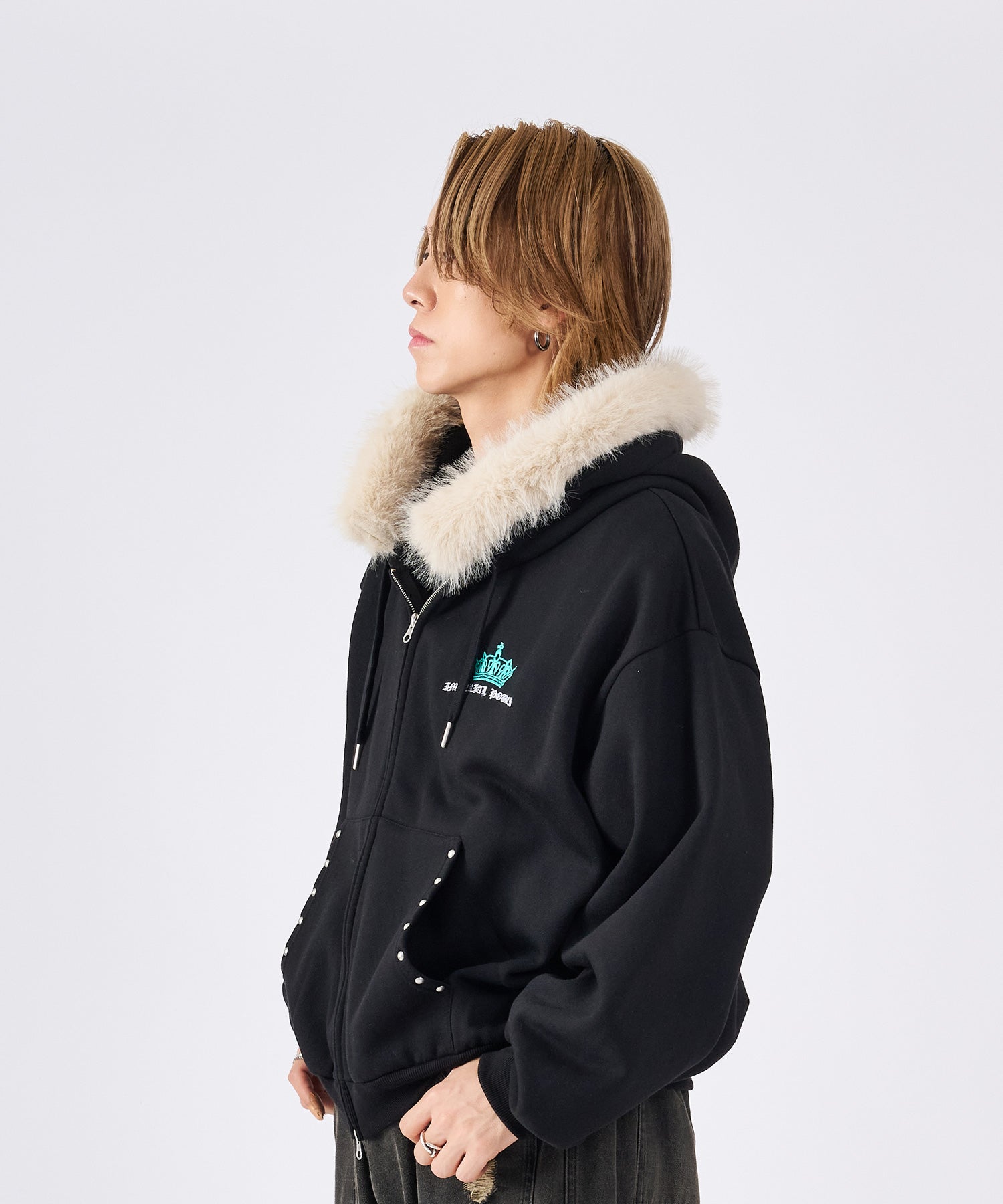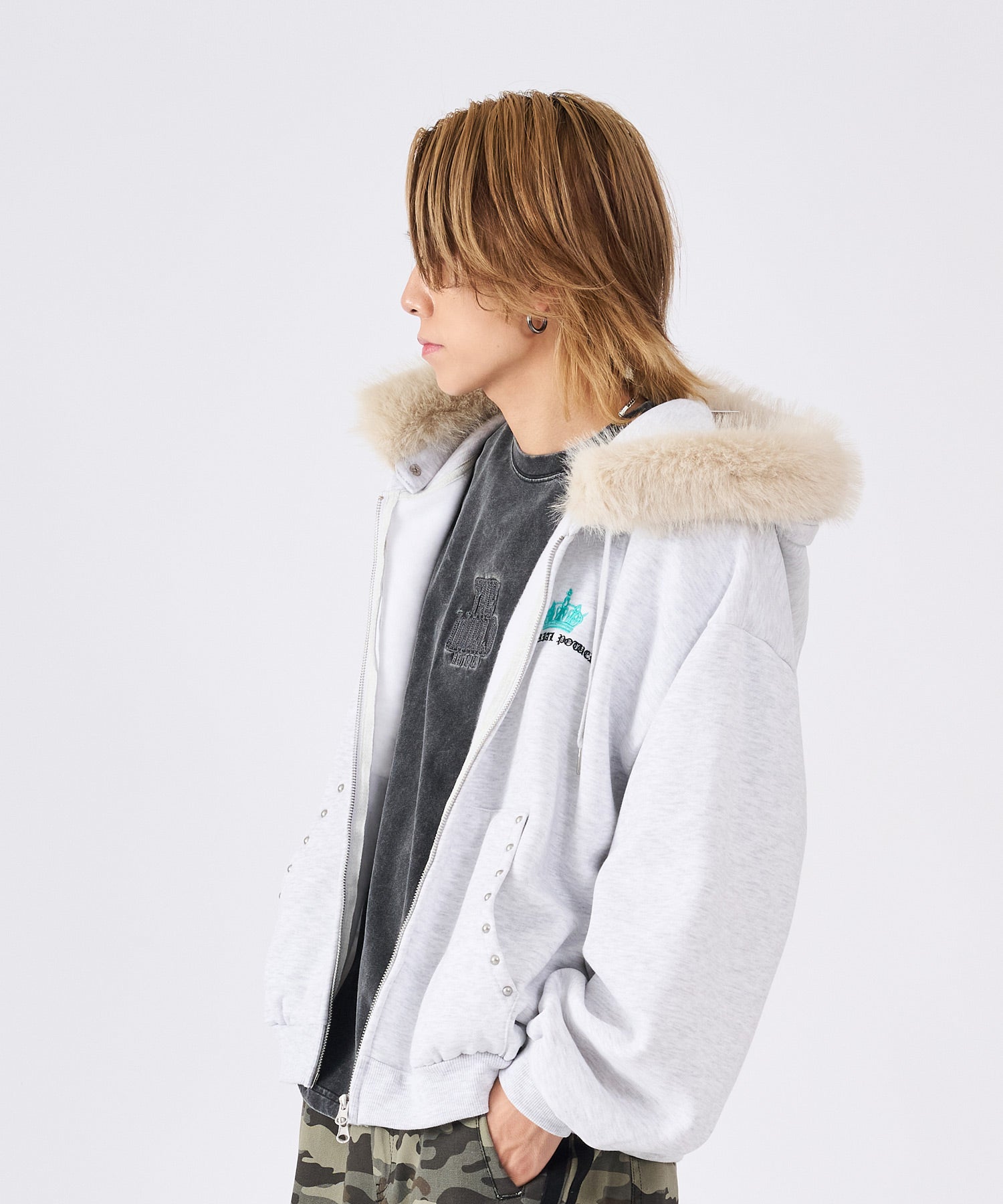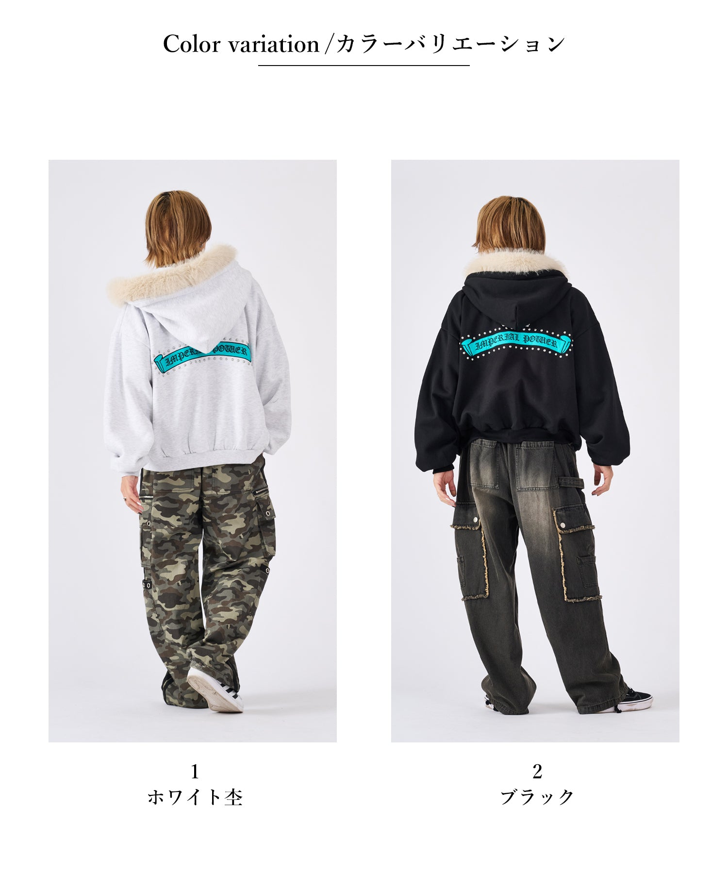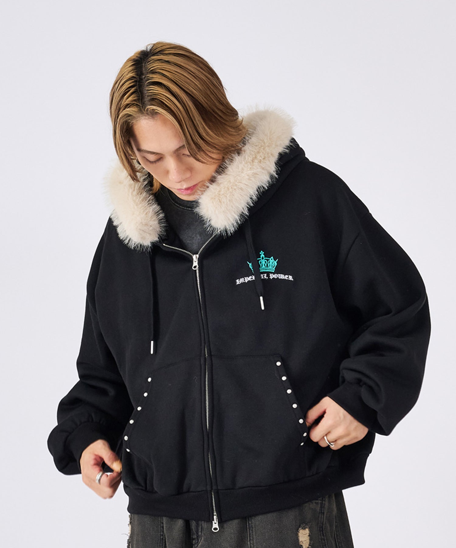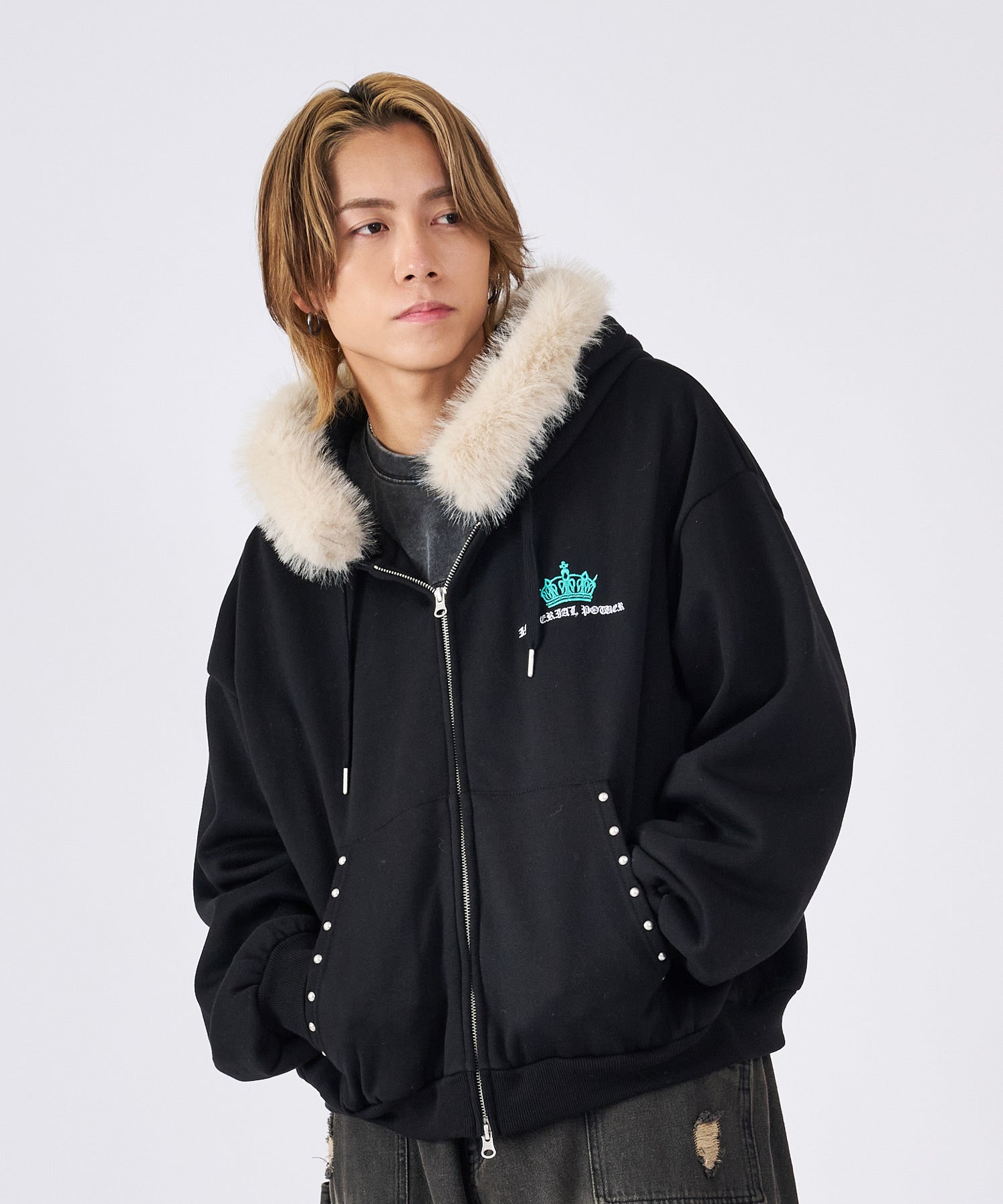 フード周りのファーは取り外し可能で、着こなしのアレンジも楽しめる❤フロントポケットと、バックのロゴ周りに配置したスタッズがお洒落でかっこいい☆ファスナーはダブルジップで上下から開閉できるのでコーデの幅も広がるアイテム♪