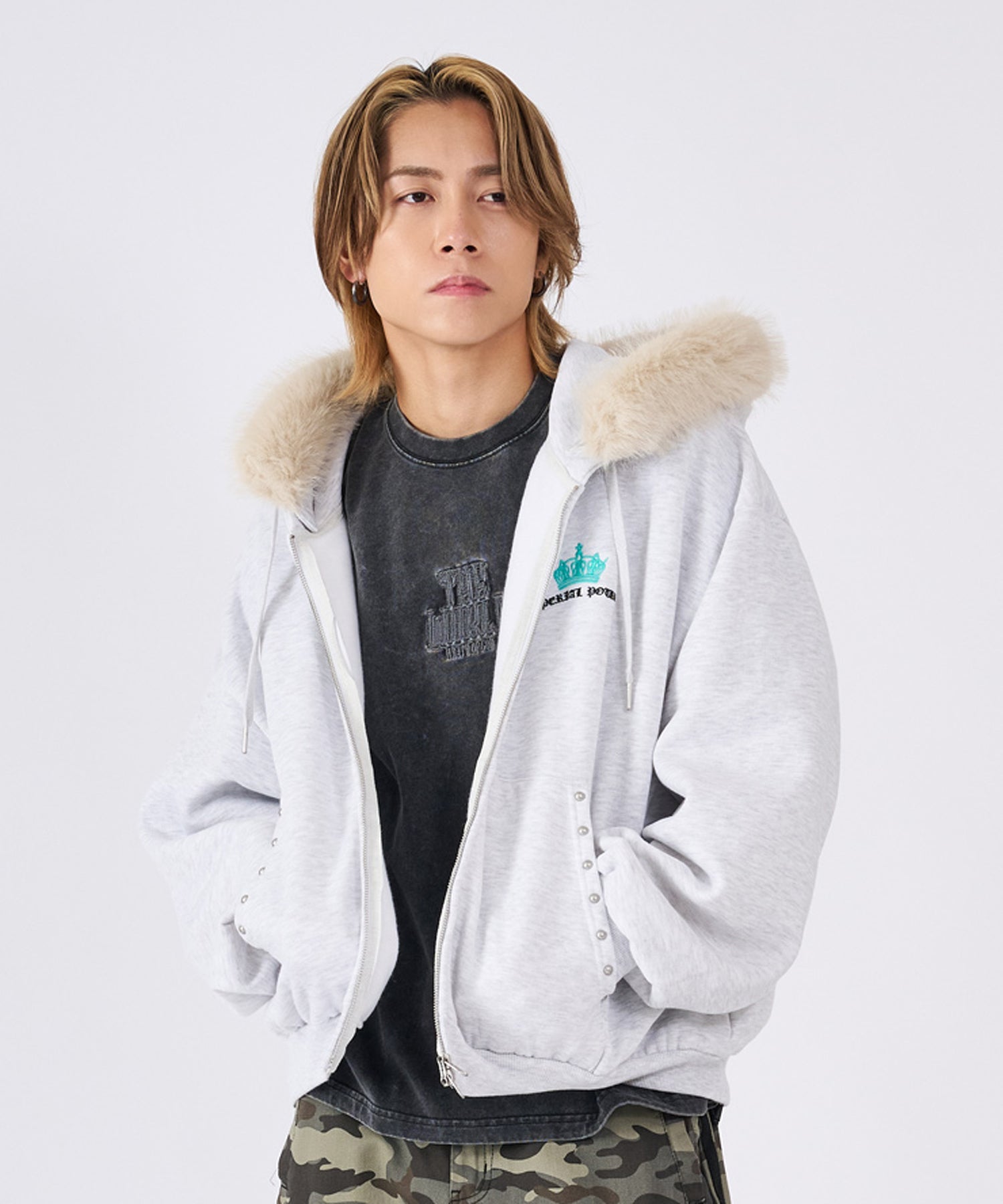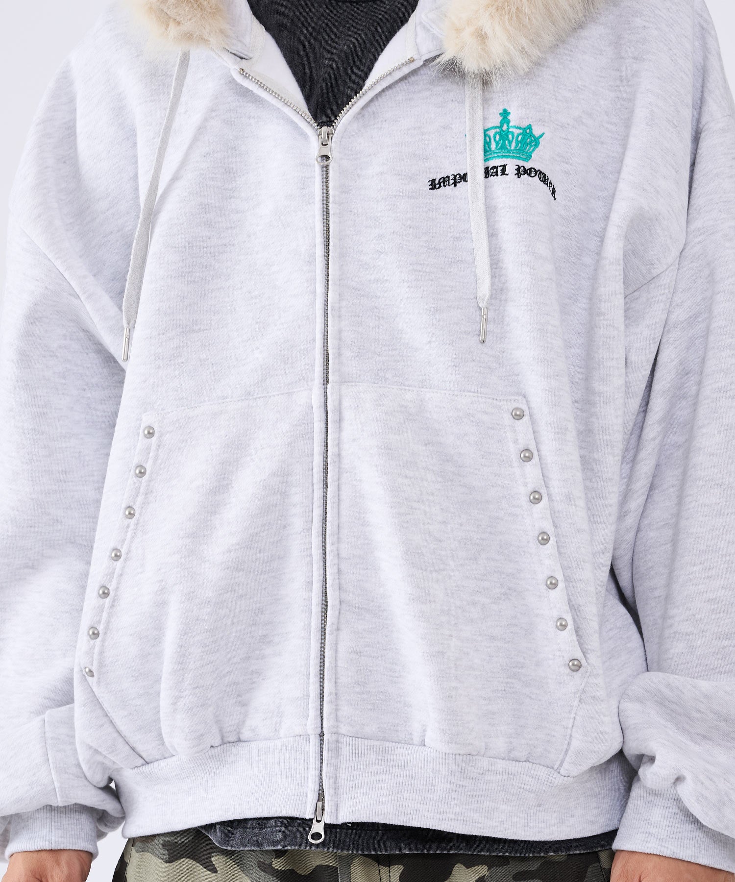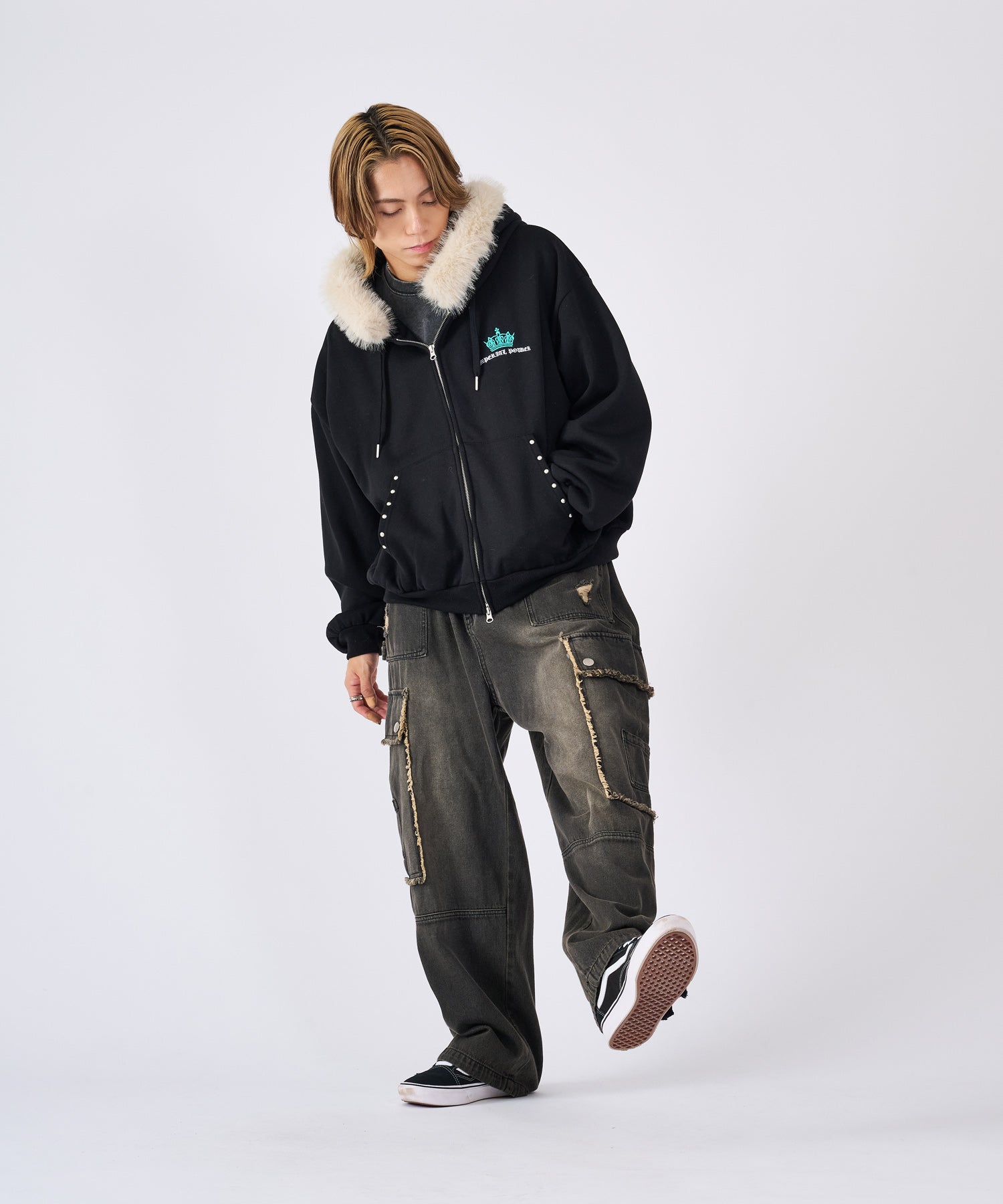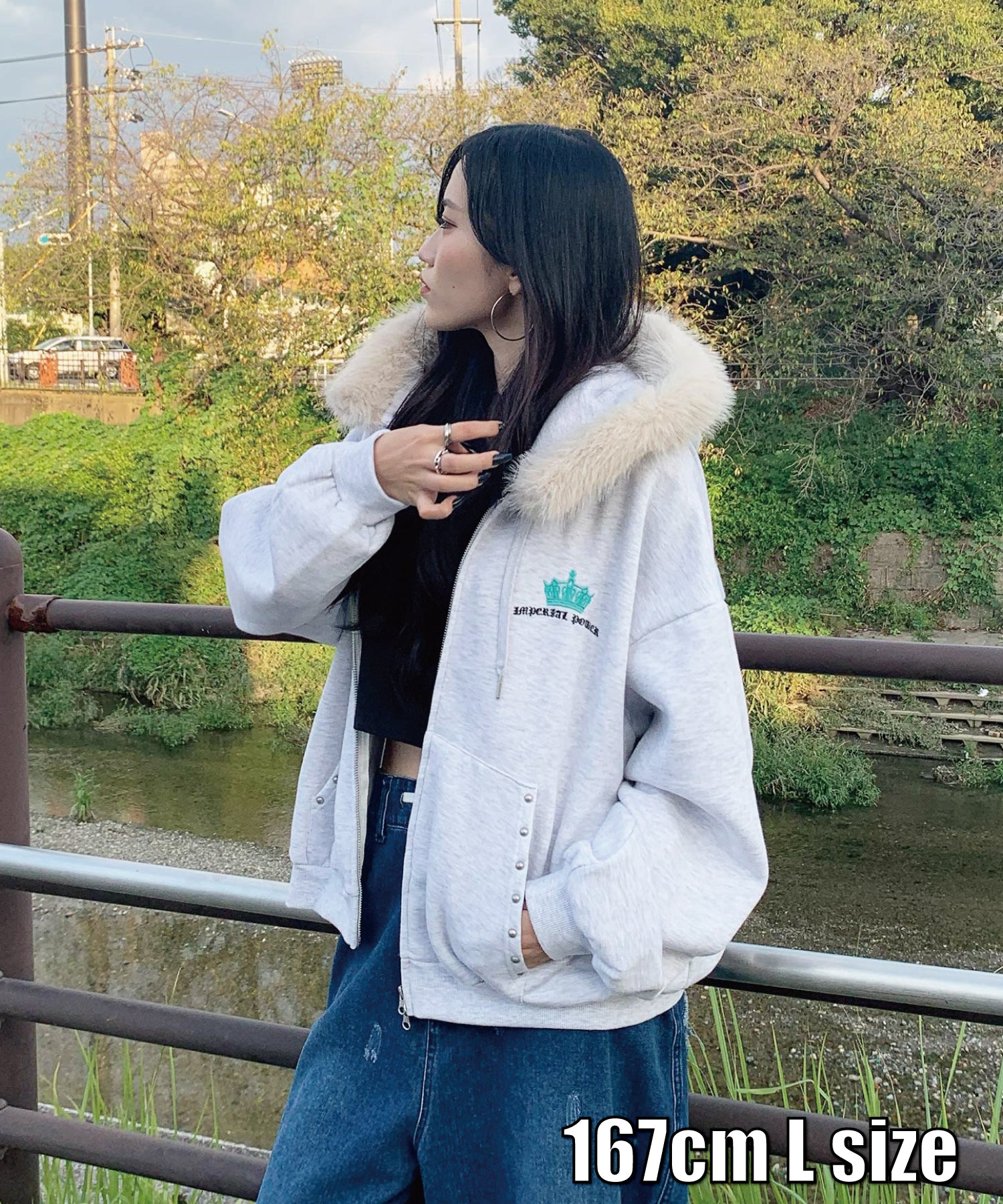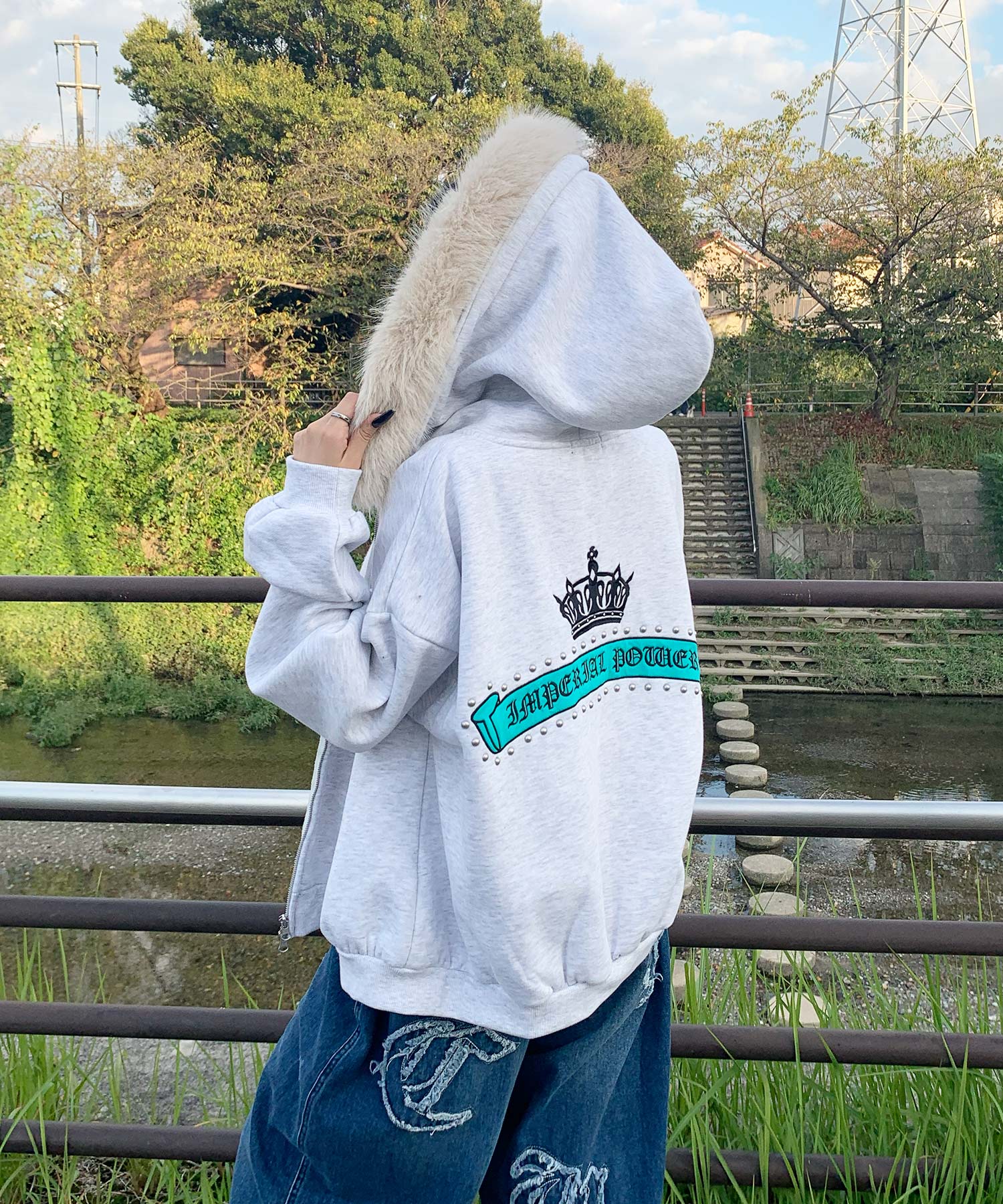フード周りのファーは取り外し可能で、着こなしのアレンジも楽しめる❤フロントポケットと、バックのロゴ周りに配置したスタッズがお洒落でかっこいい☆ファスナーはダブルジップで上下から開閉できるのでコーデの幅も広がるアイテム♪