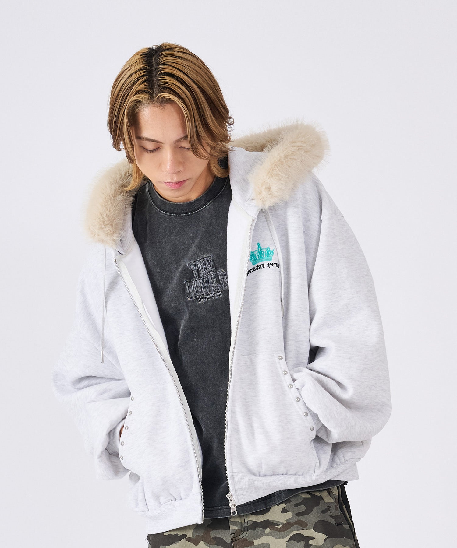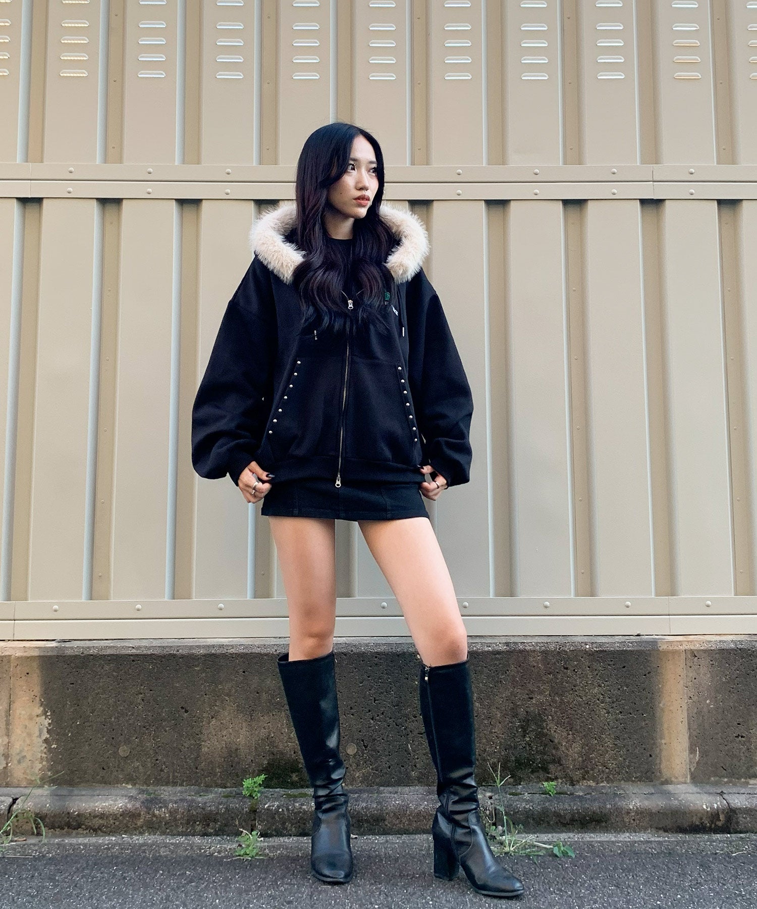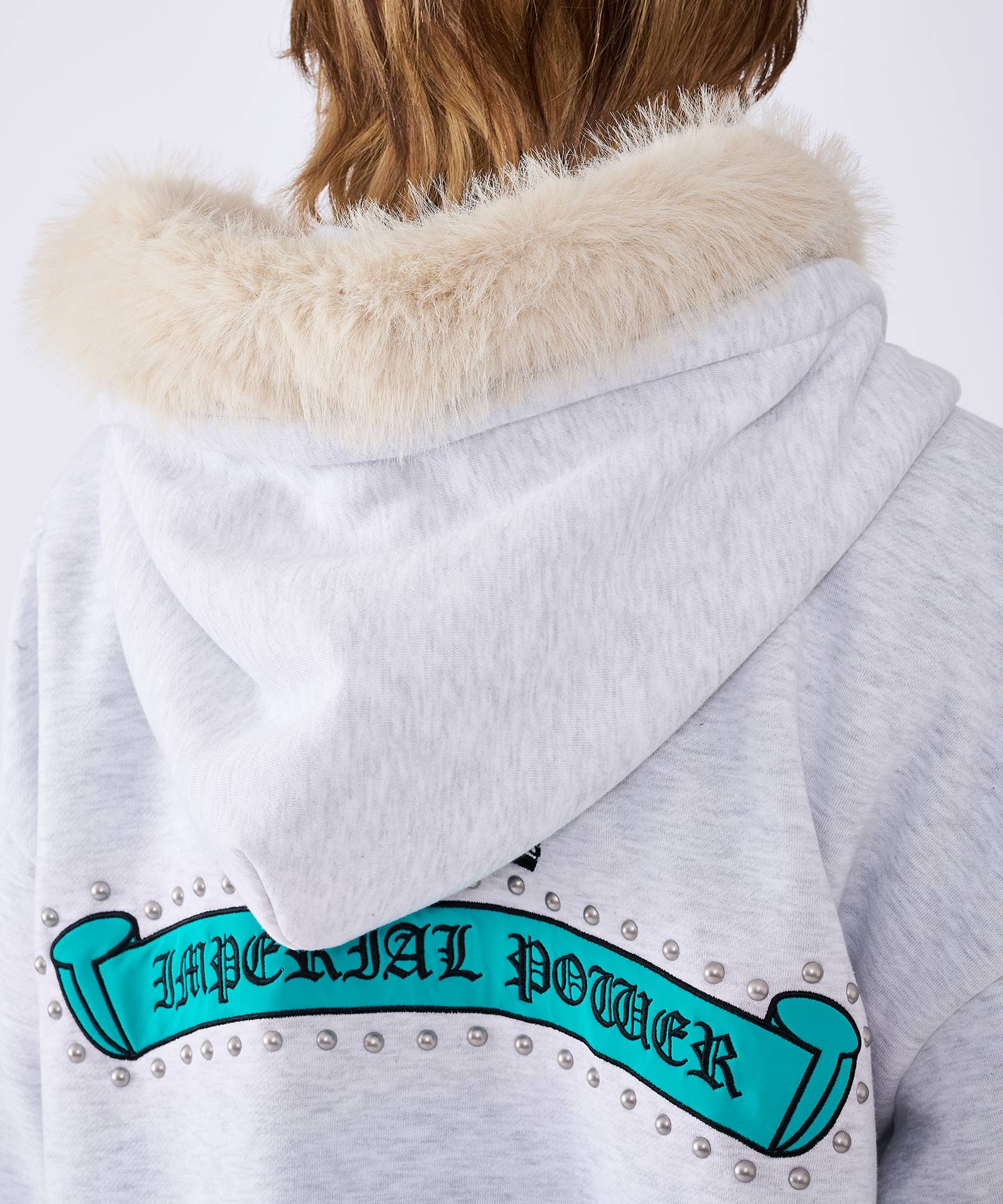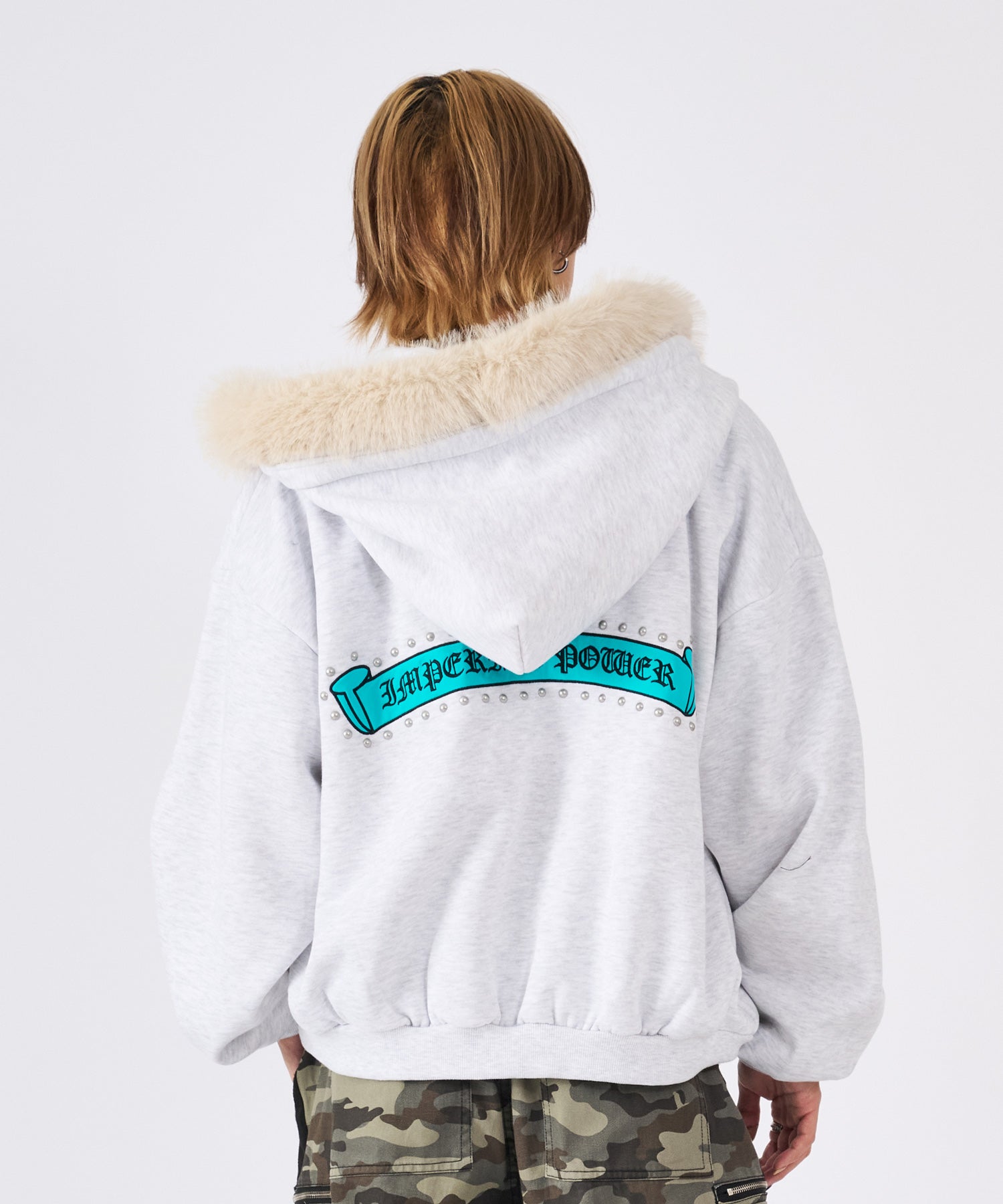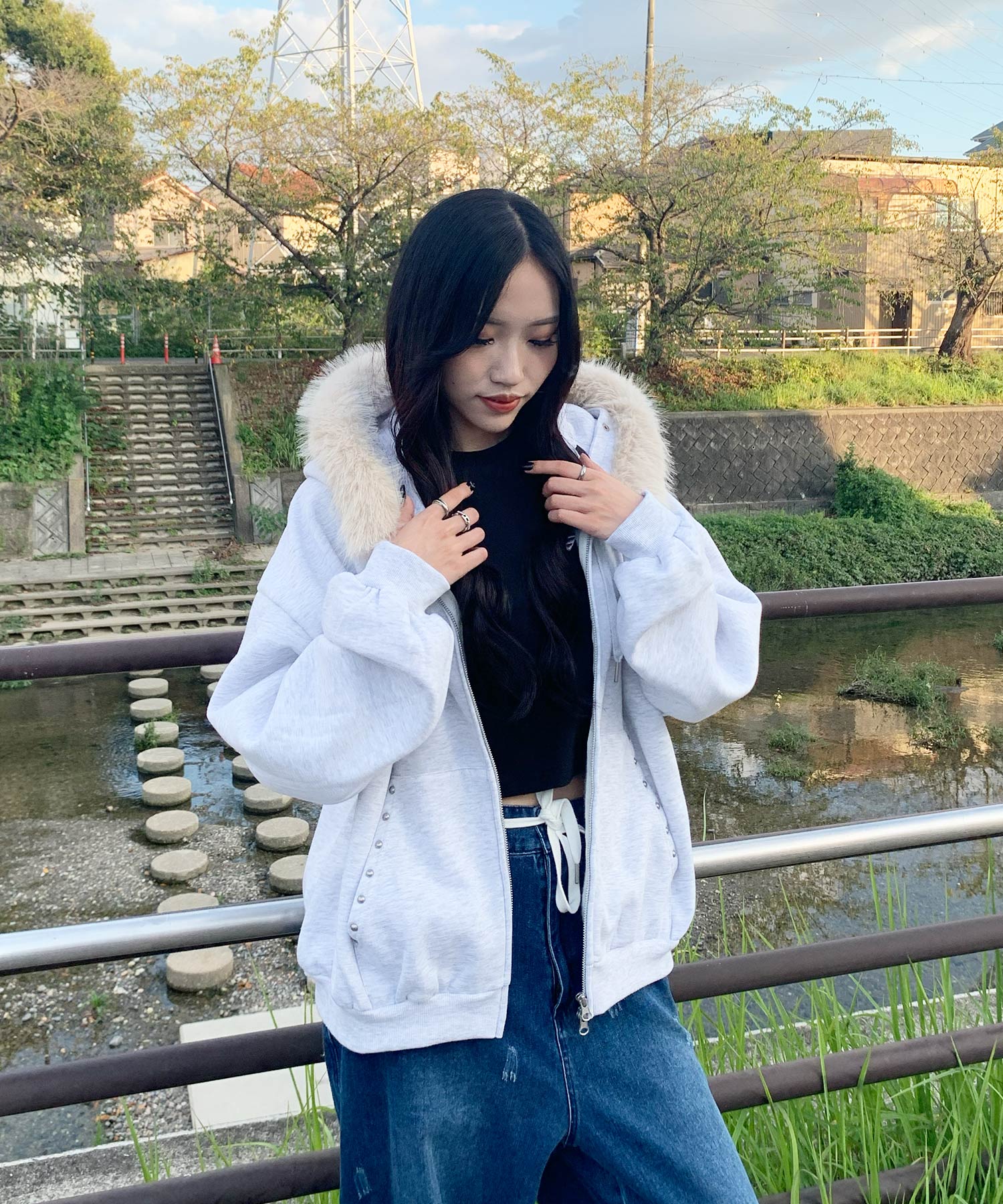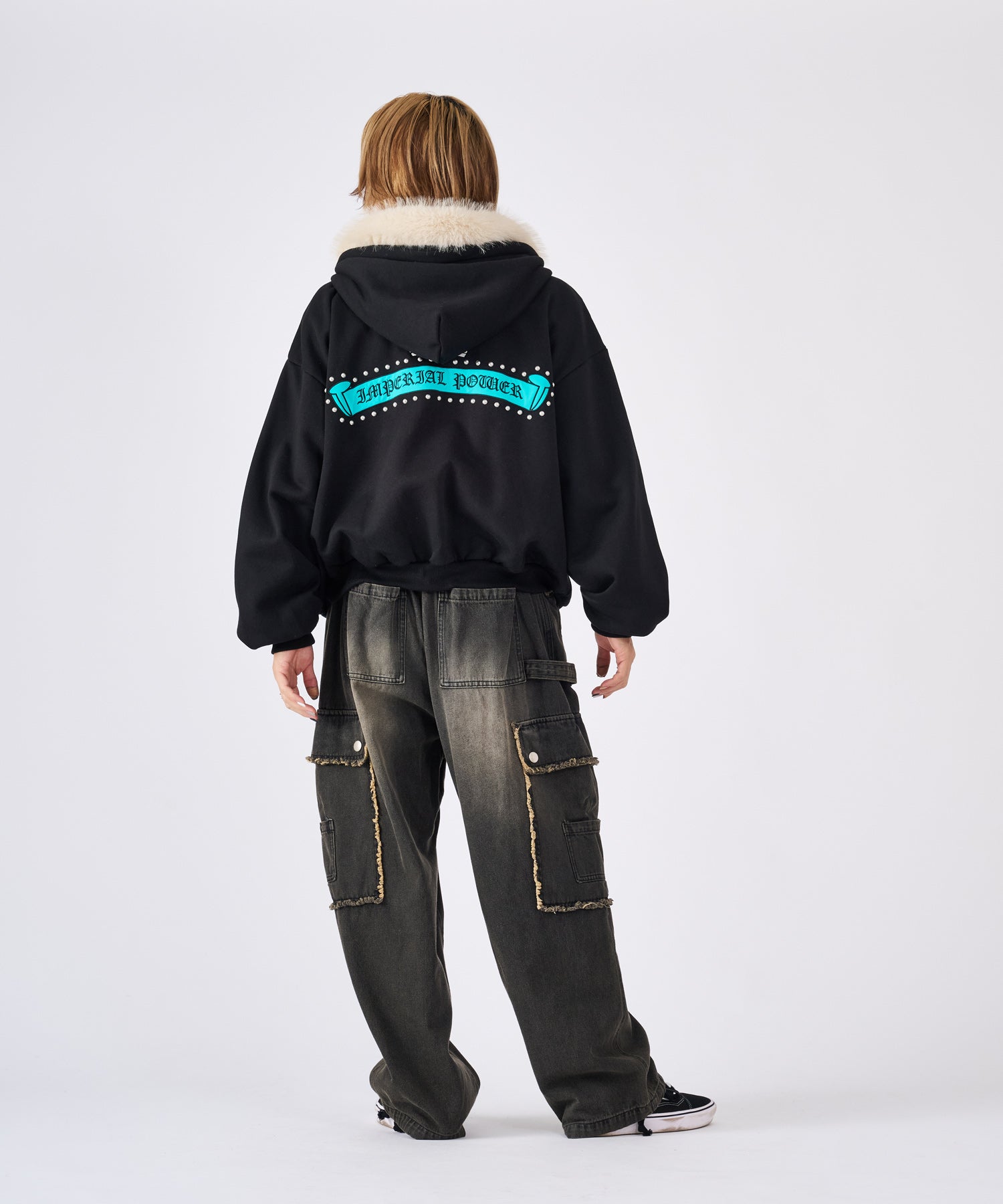 フード周りのファーは取り外し可能で、着こなしのアレンジも楽しめる❤フロントポケットと、バックのロゴ周りに配置したスタッズがお洒落でかっこいい☆ファスナーはダブルジップで上下から開閉できるのでコーデの幅も広がるアイテム♪