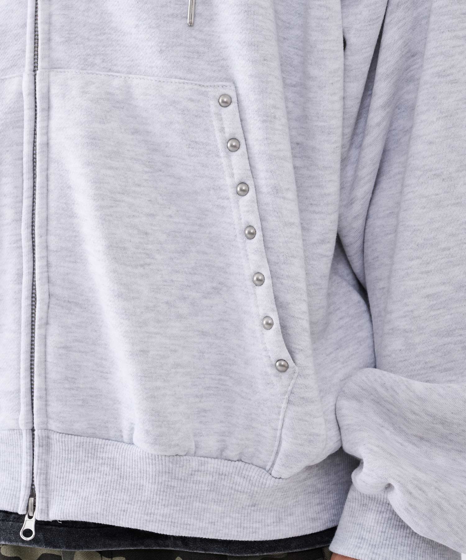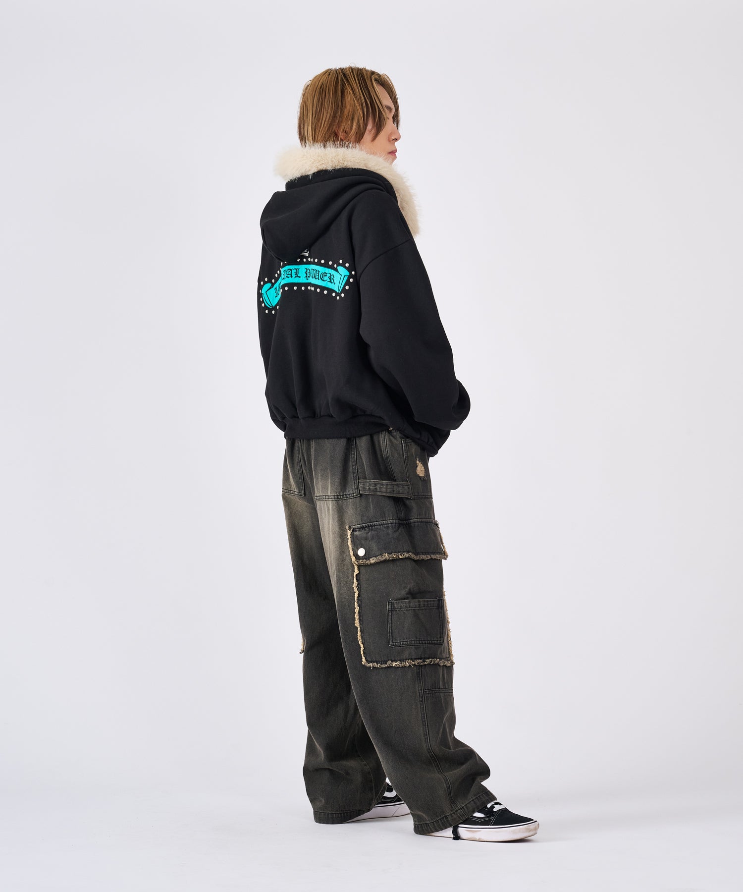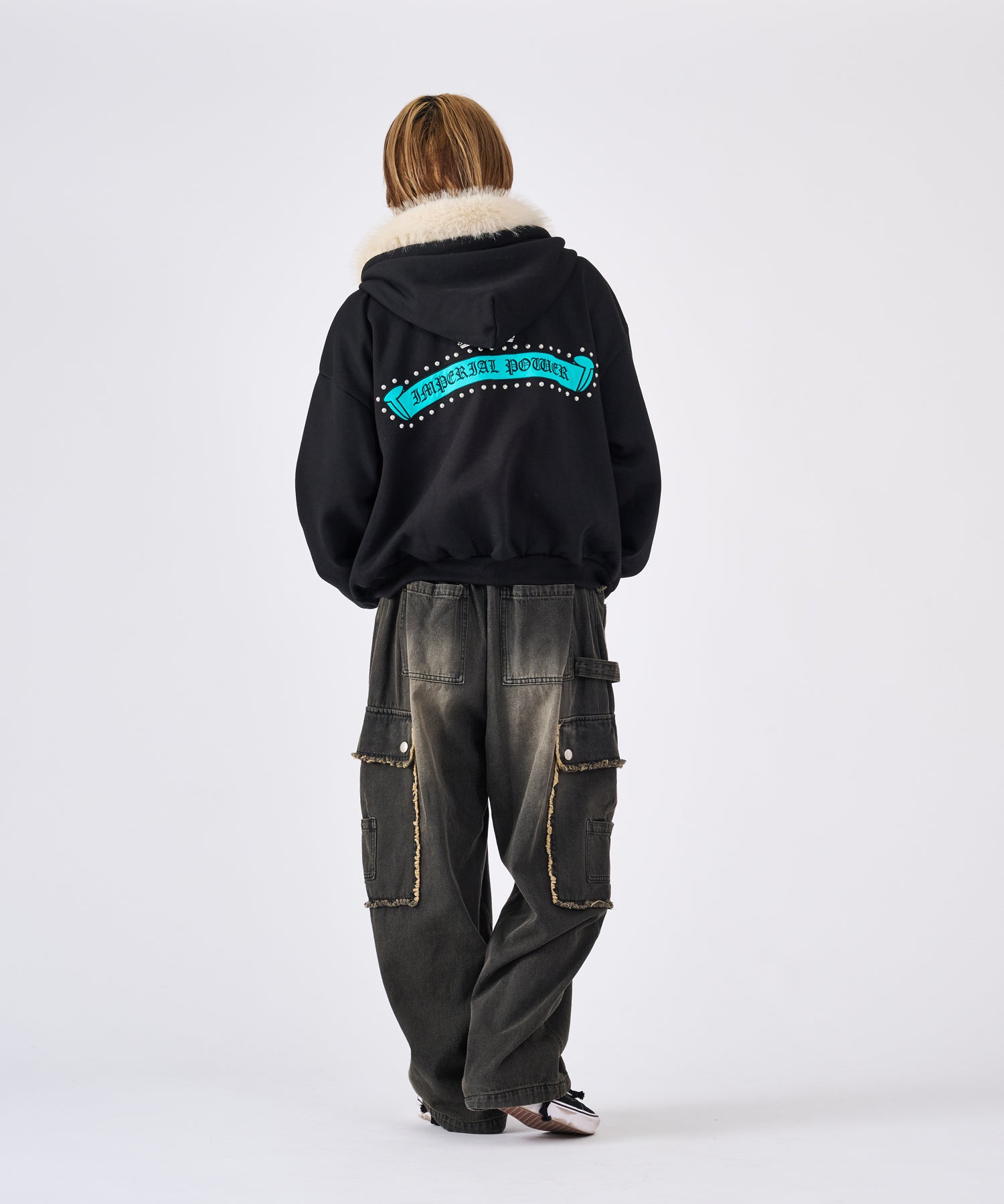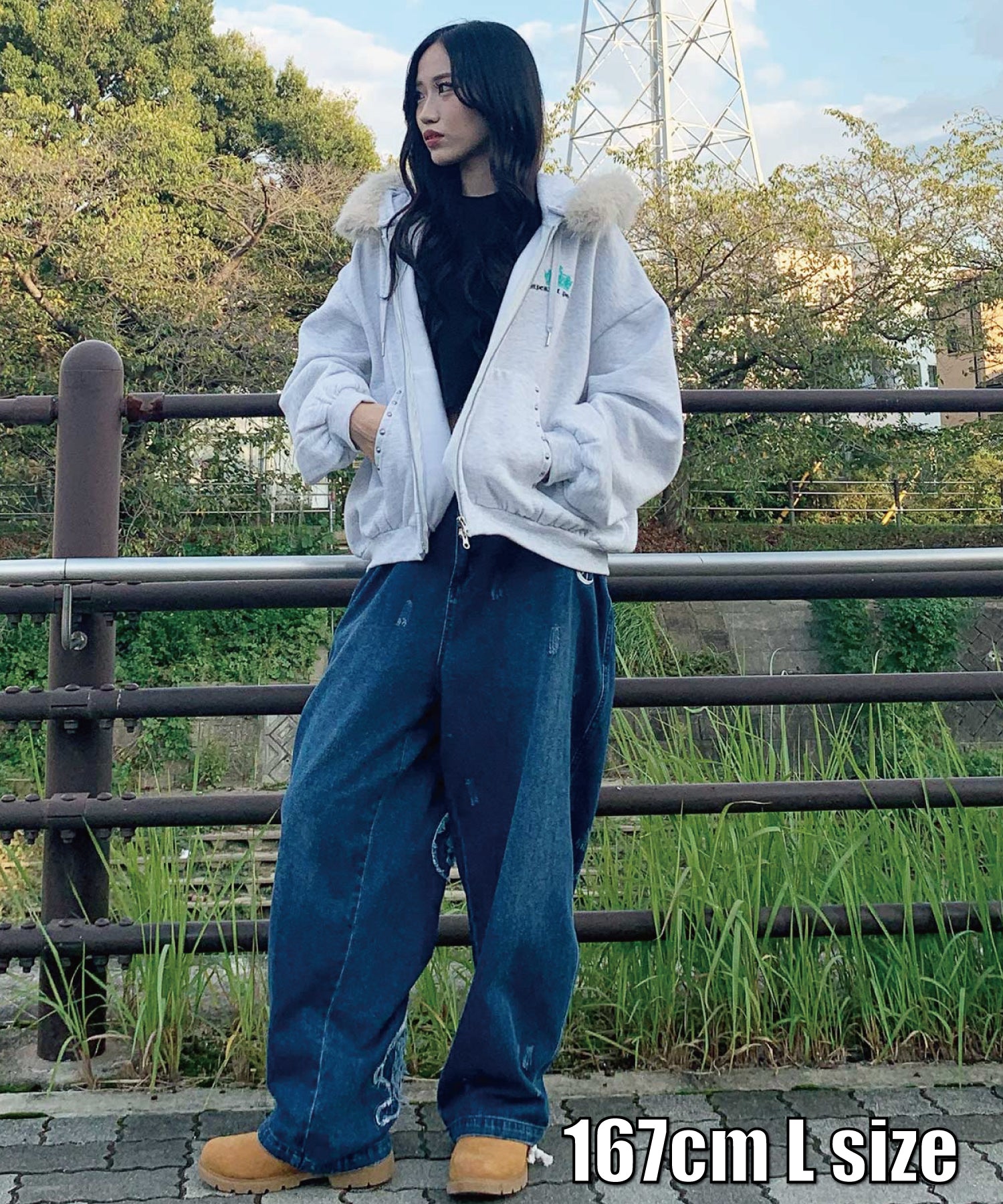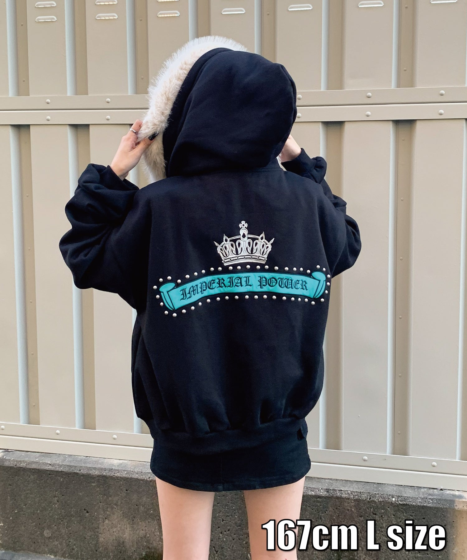フード周りのファーは取り外し可能で、着こなしのアレンジも楽しめる❤フロントポケットと、バックのロゴ周りに配置したスタッズがお洒落でかっこいい☆ファスナーはダブルジップで上下から開閉できるのでコーデの幅も広がるアイテム♪
