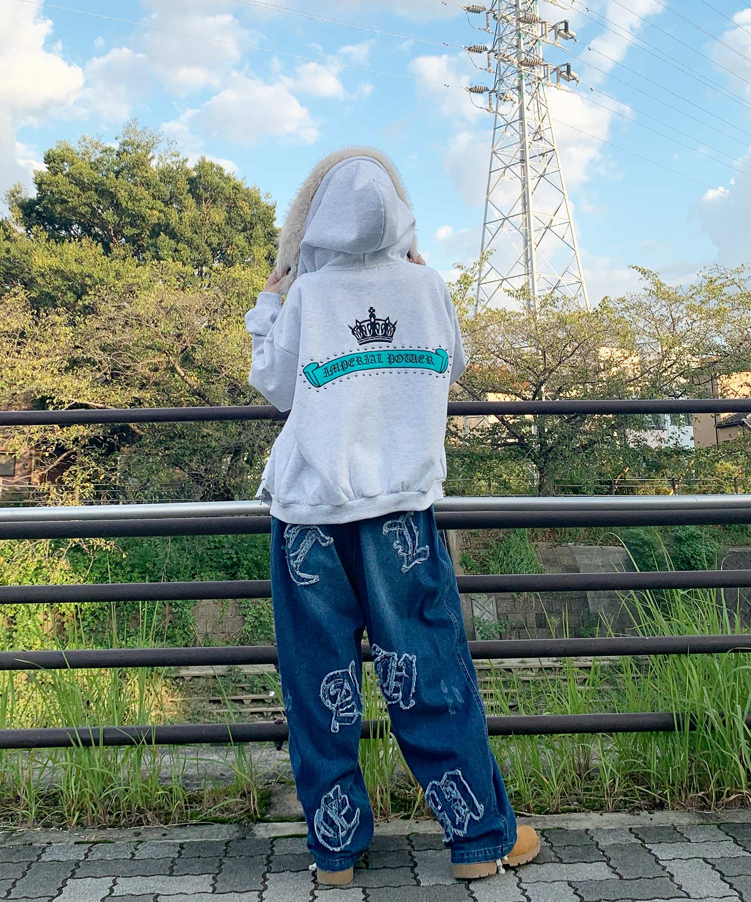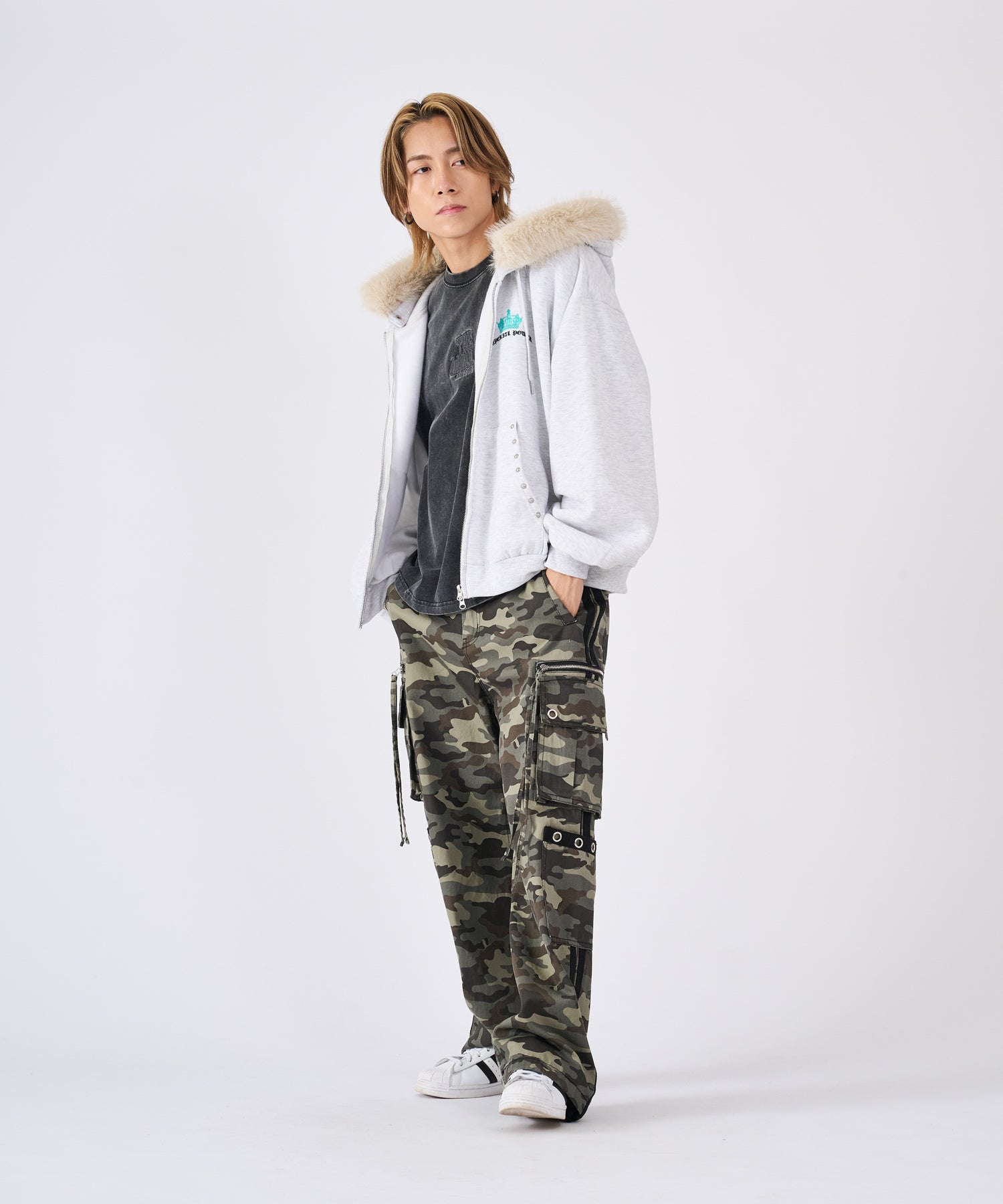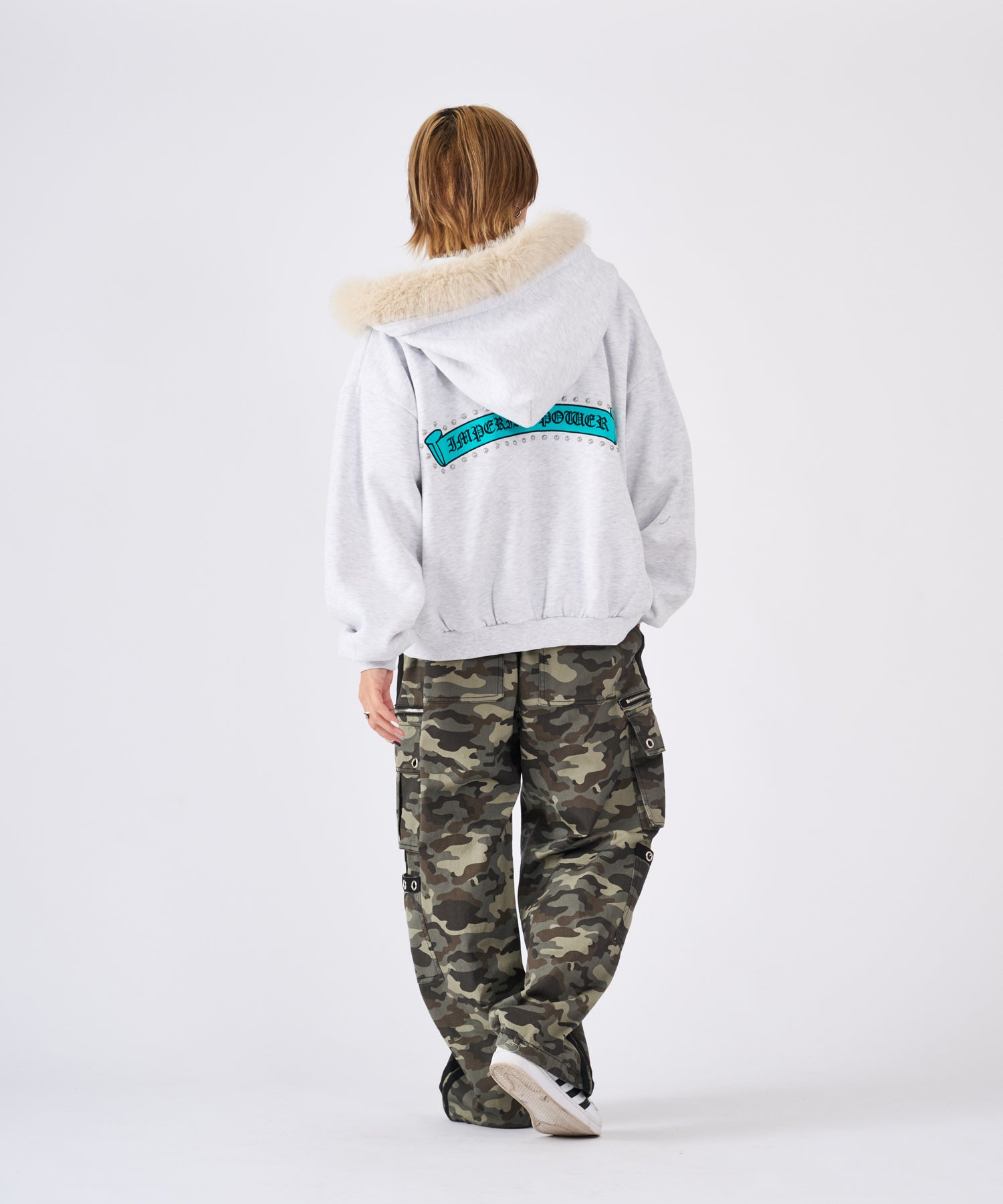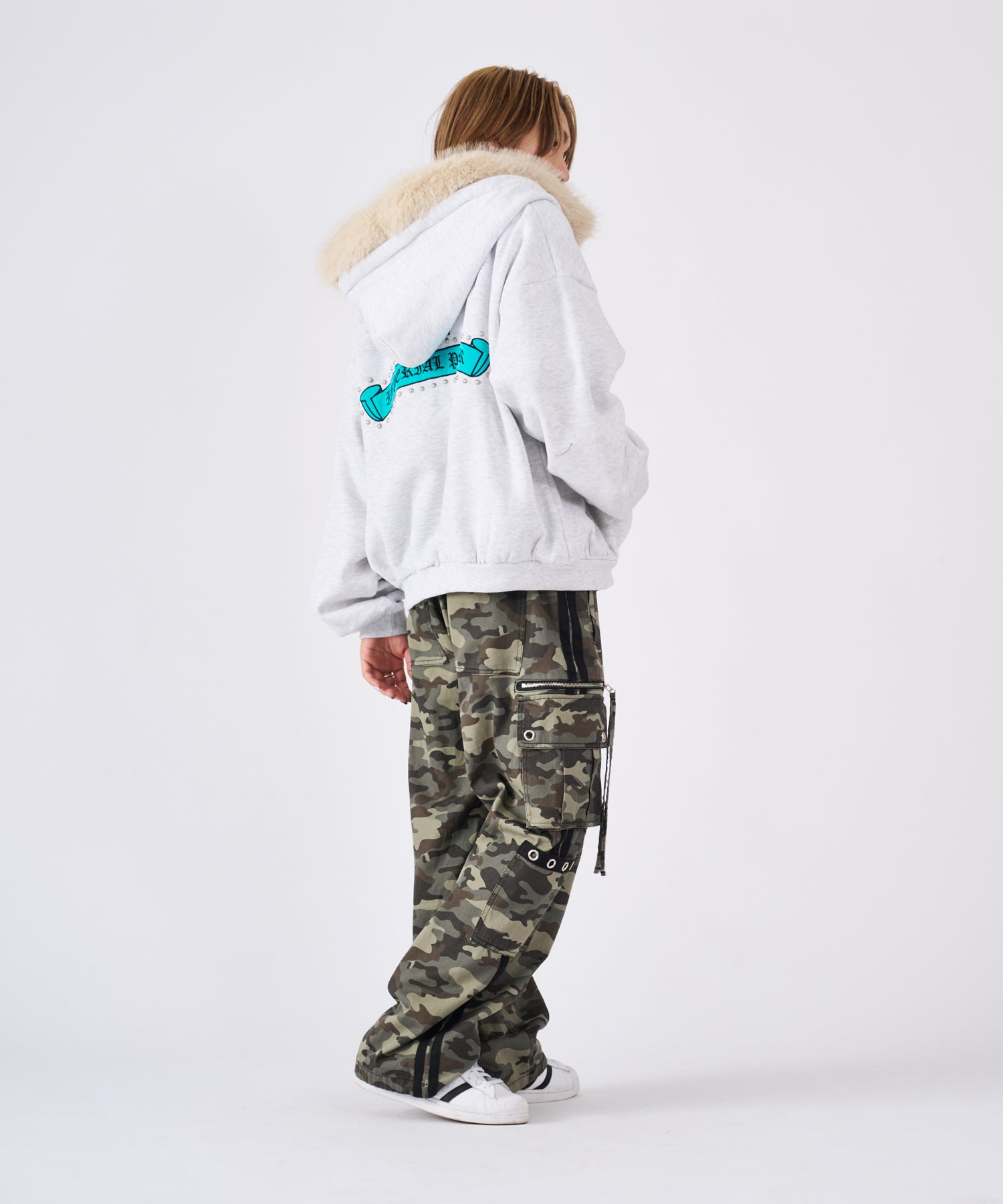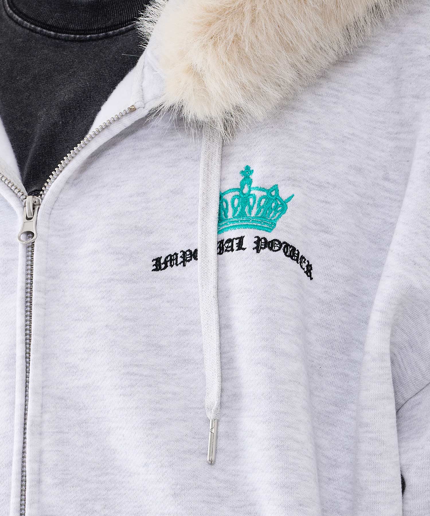 フード周りのファーは取り外し可能で、着こなしのアレンジも楽しめる❤フロントポケットと、バックのロゴ周りに配置したスタッズがお洒落でかっこいい☆ファスナーはダブルジップで上下から開閉できるのでコーデの幅も広がるアイテム♪