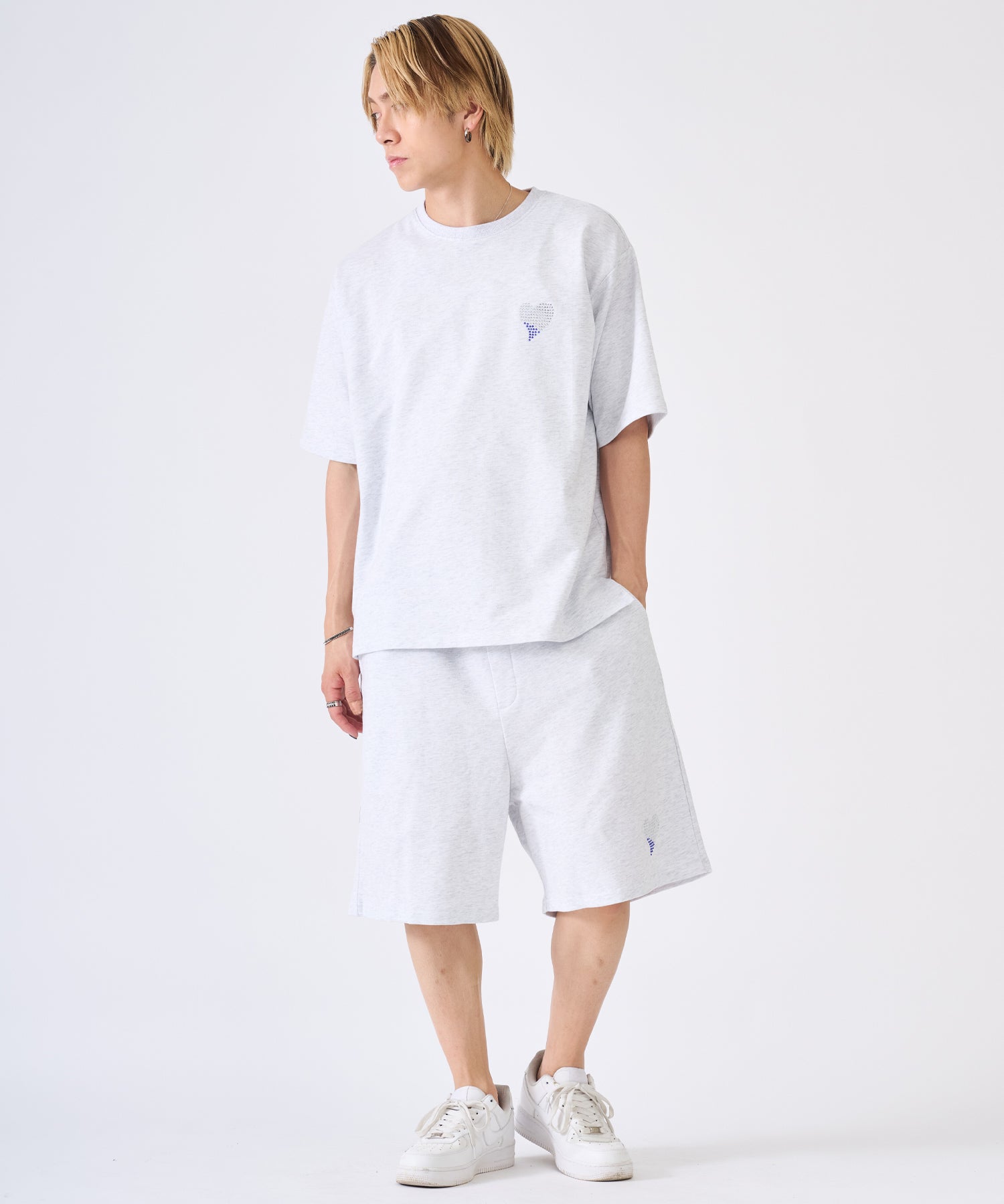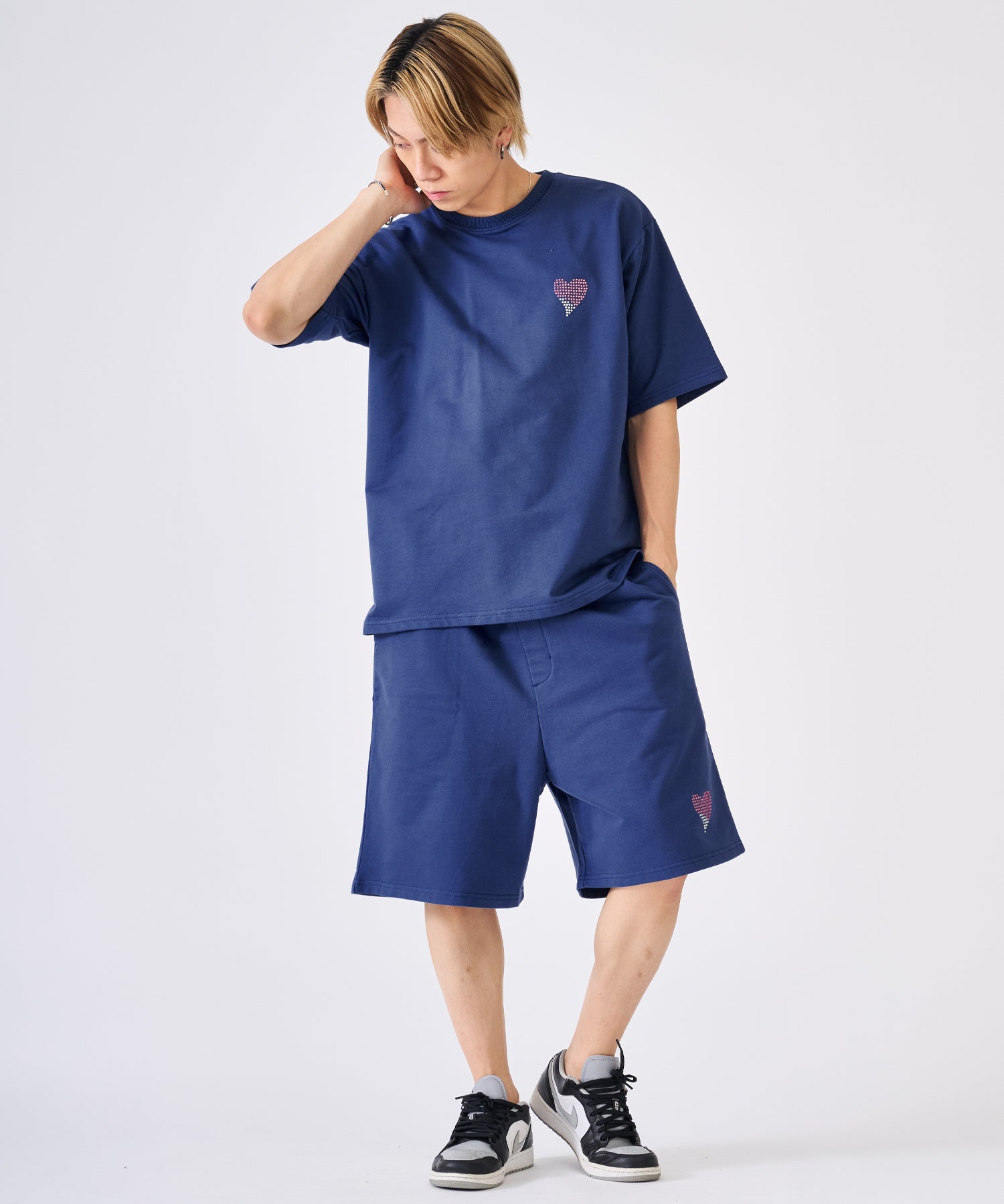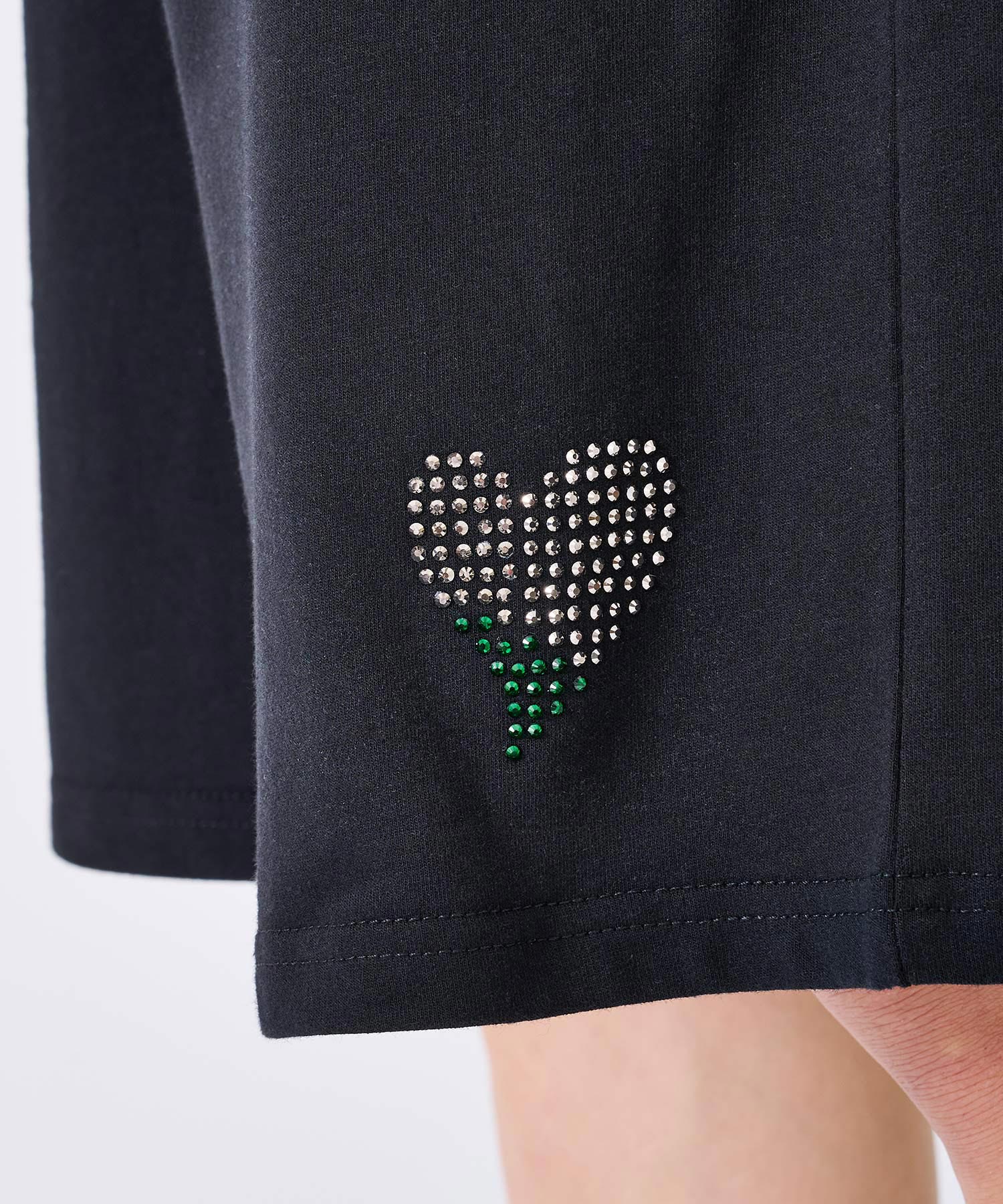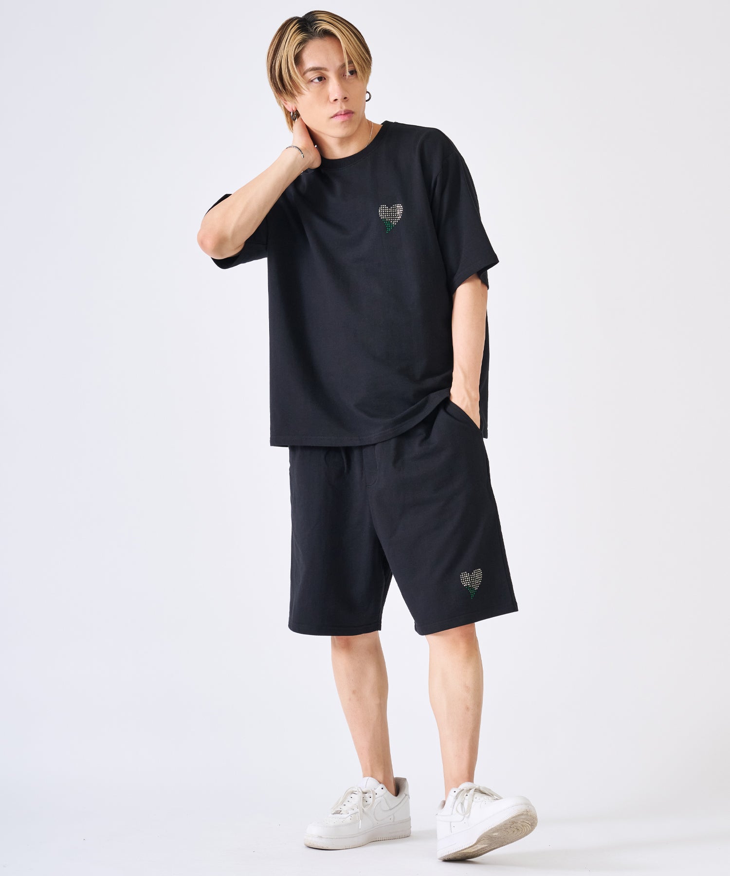 Tシャツの胸とショートパンツの左裾にあるワンポイントは2色のラインストーンを使ったハート型❤