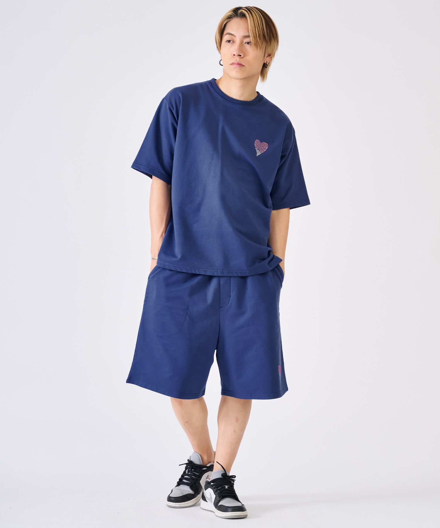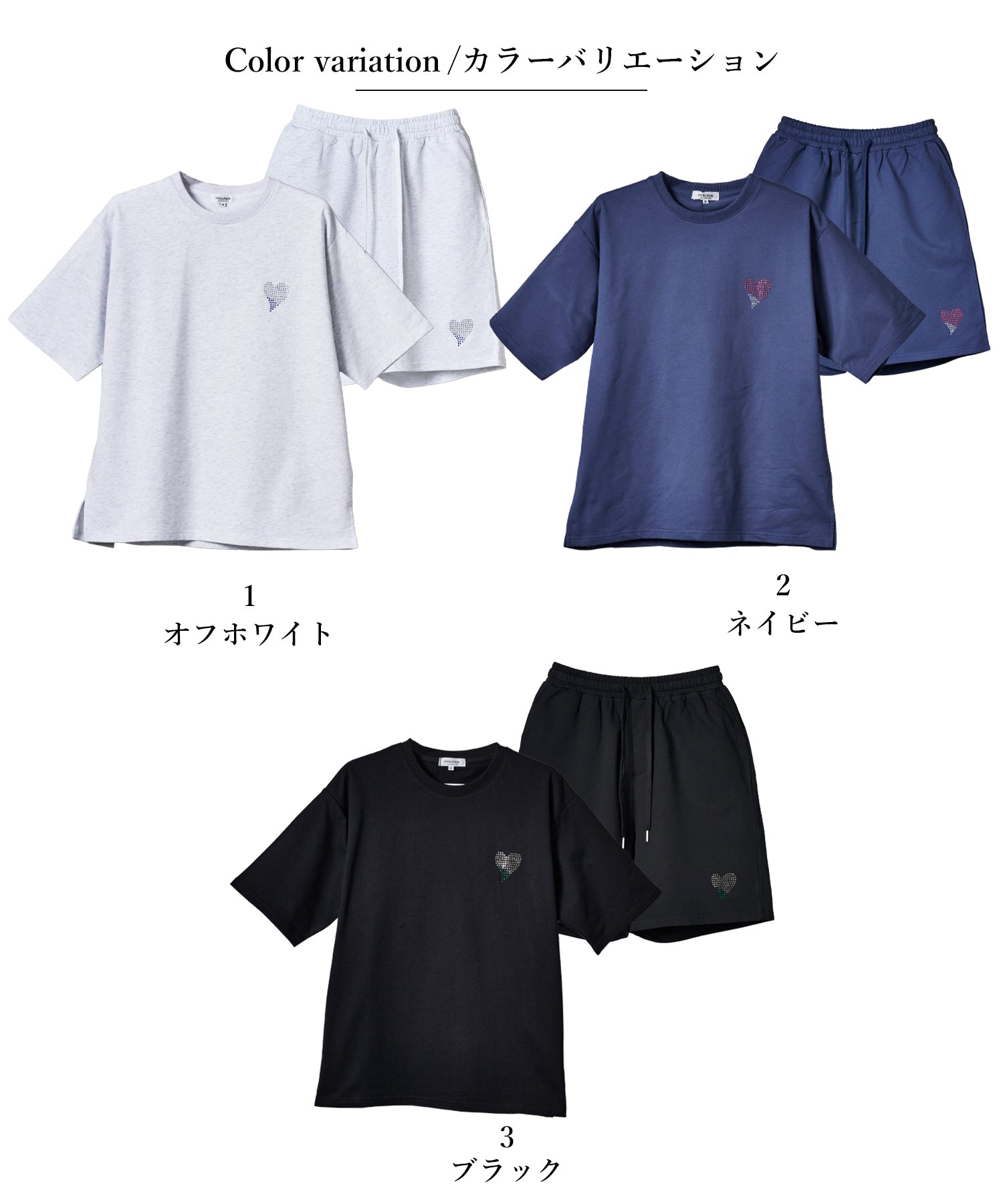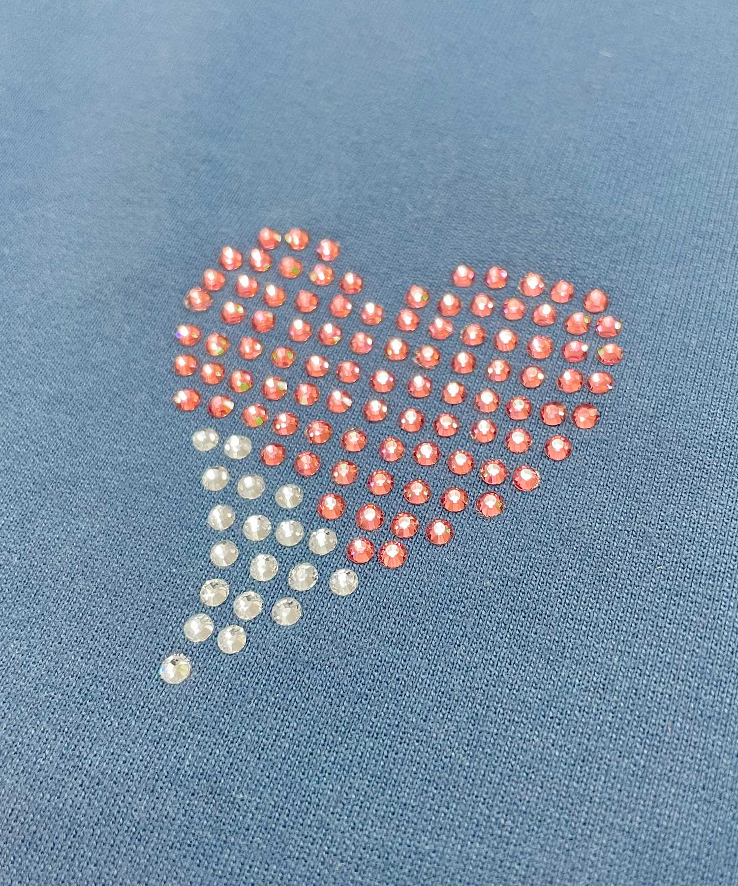 Tシャツの胸とショートパンツの左裾にあるワンポイントは2色のラインストーンを使ったハート型❤