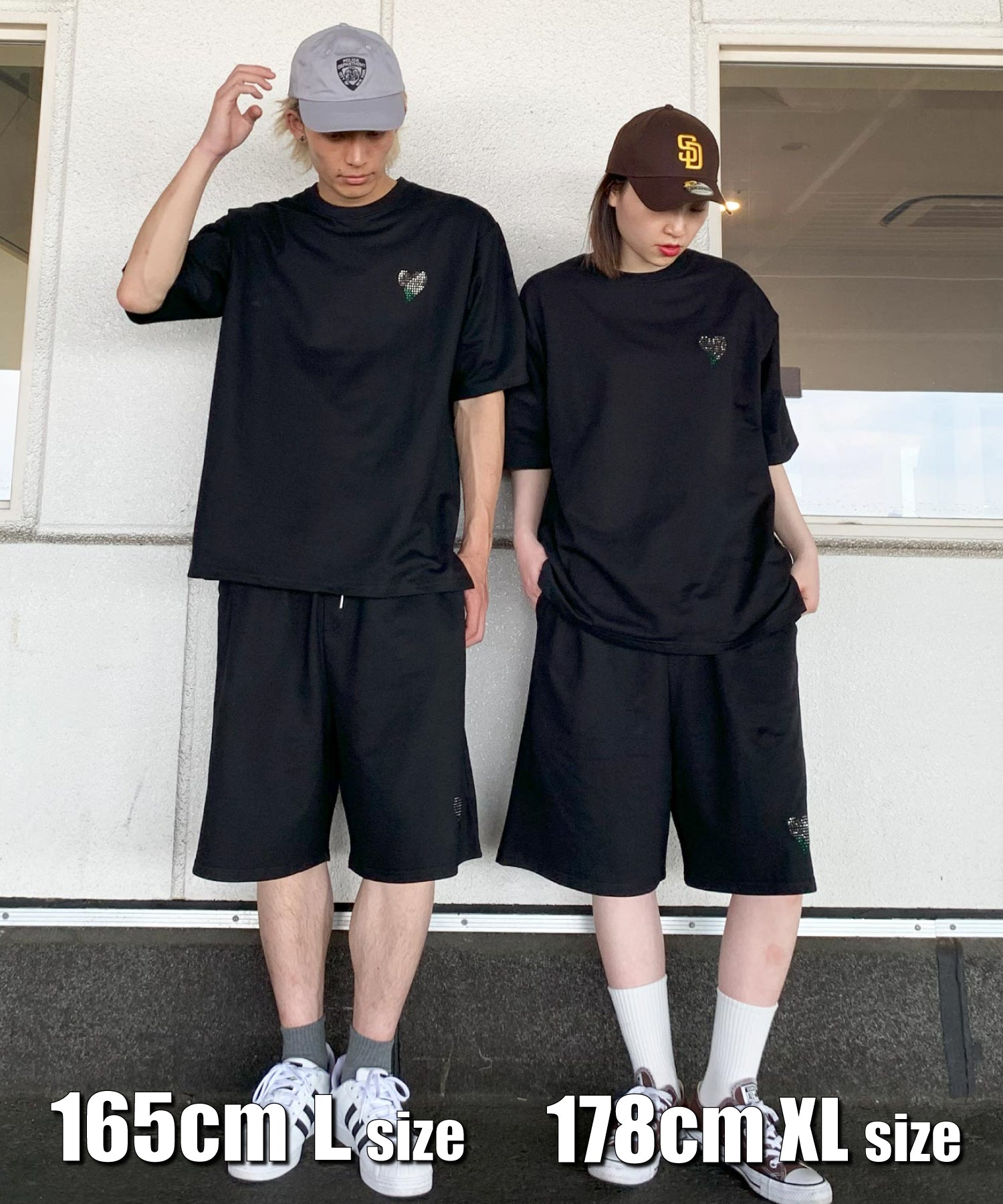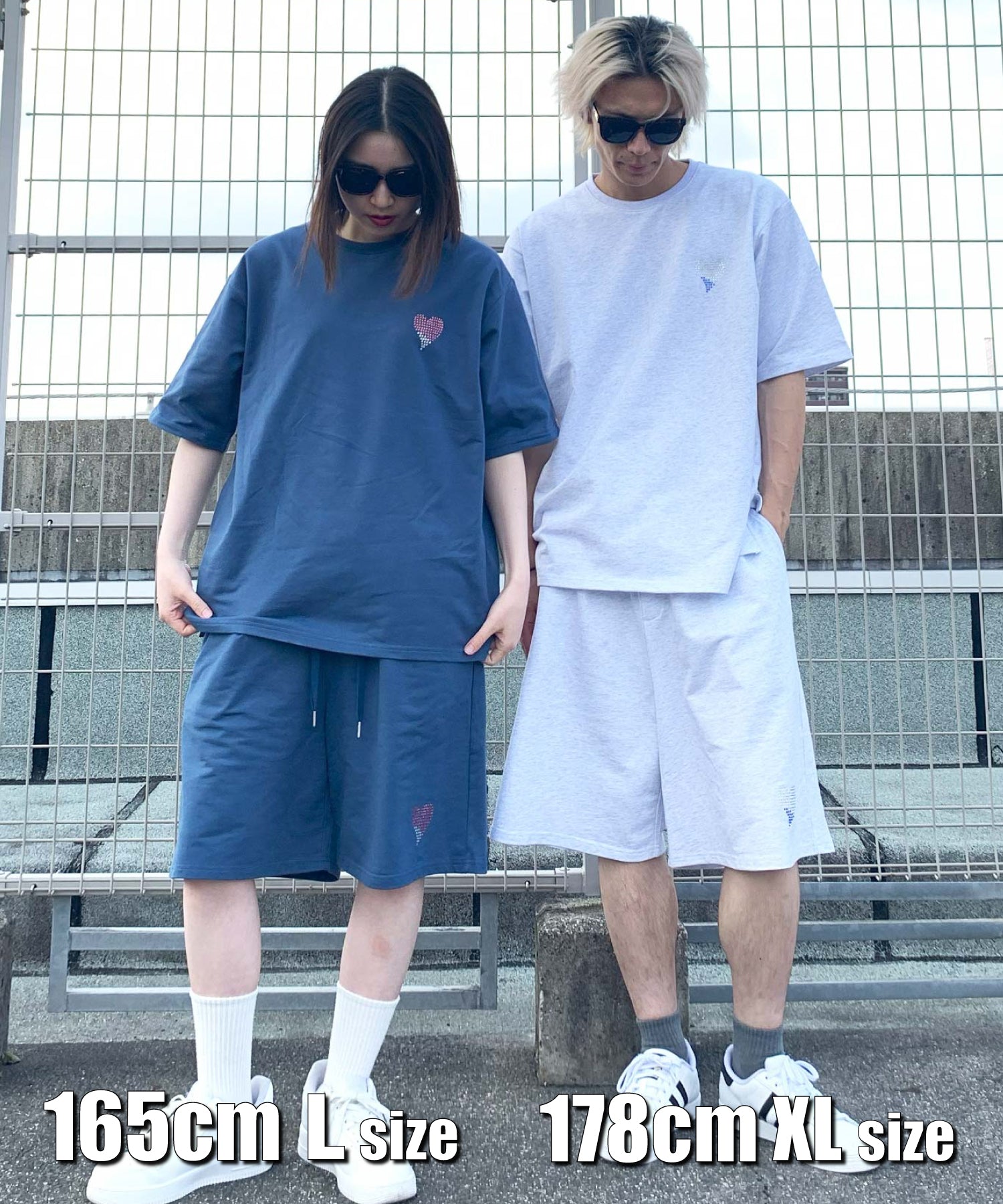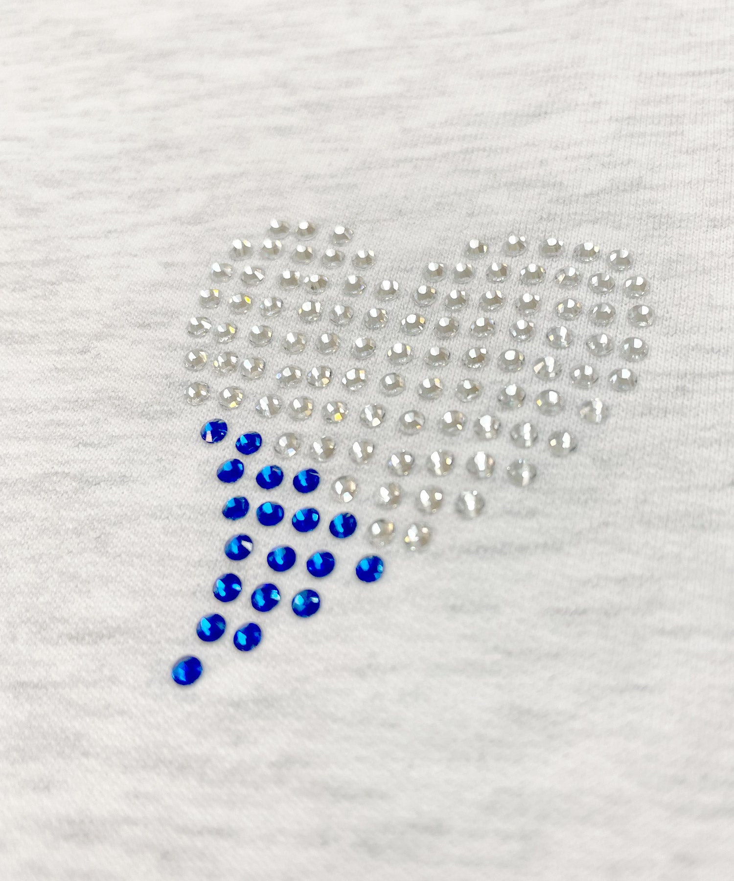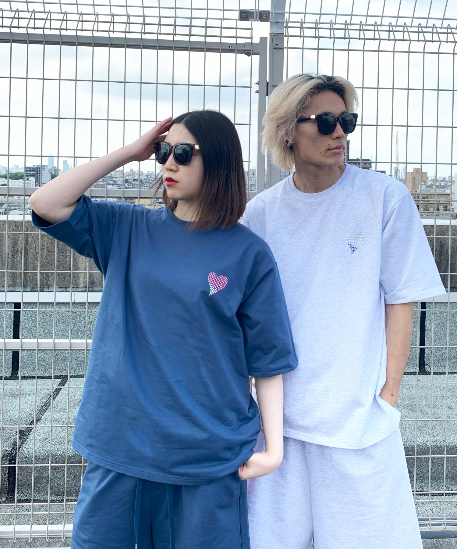 Tシャツの胸とショートパンツの左裾にあるワンポイントは2色のラインストーンを使ったハート型❤
