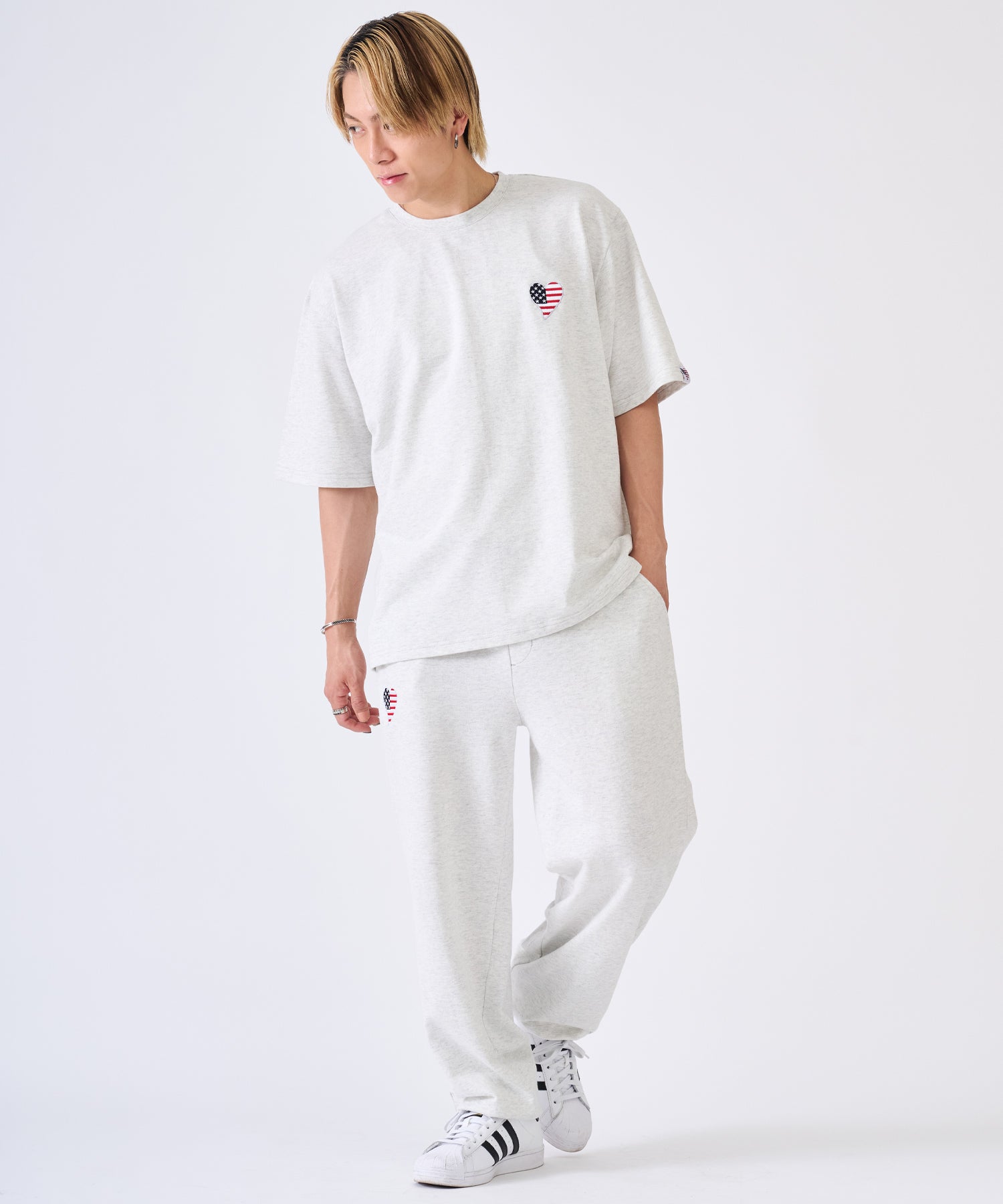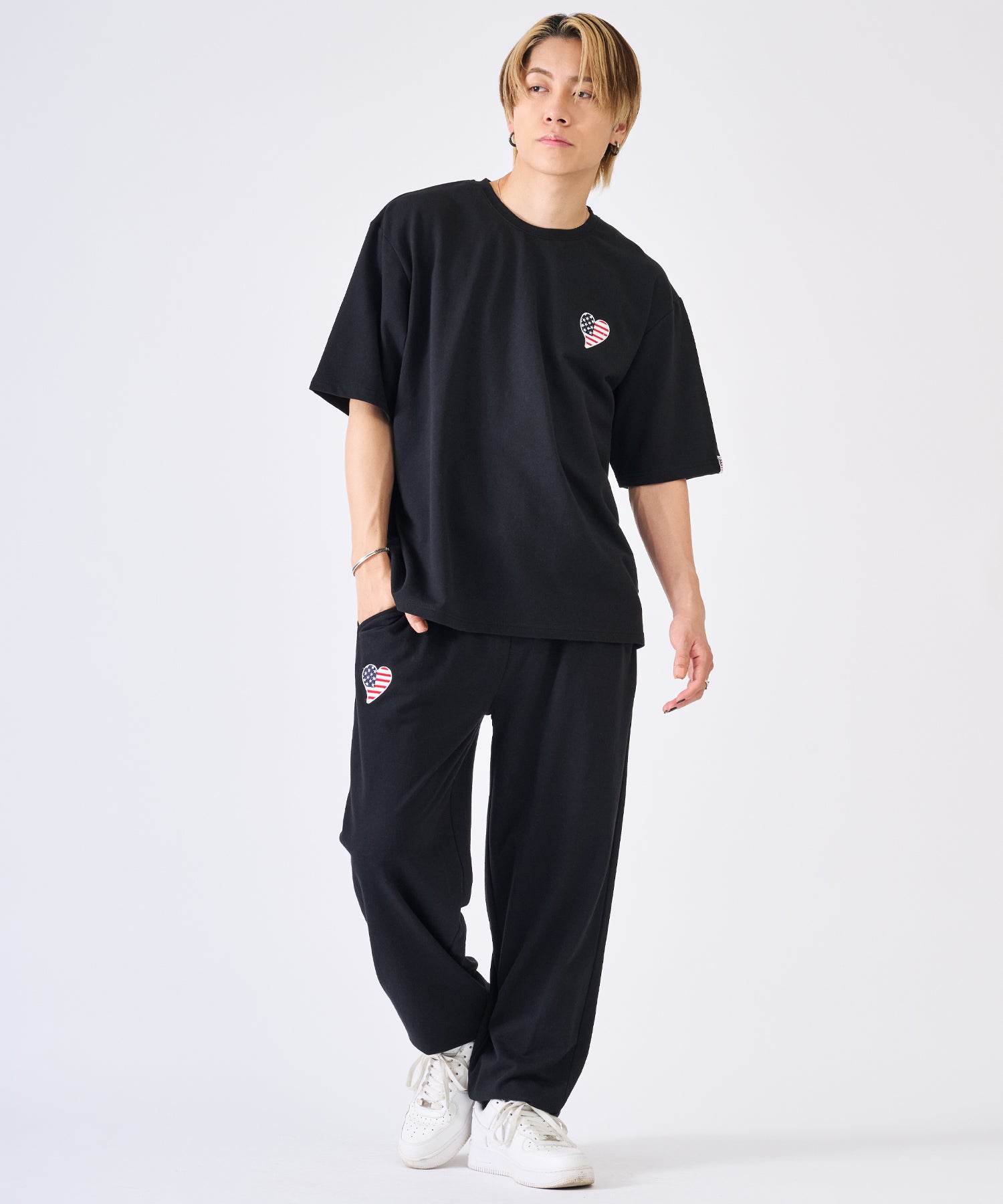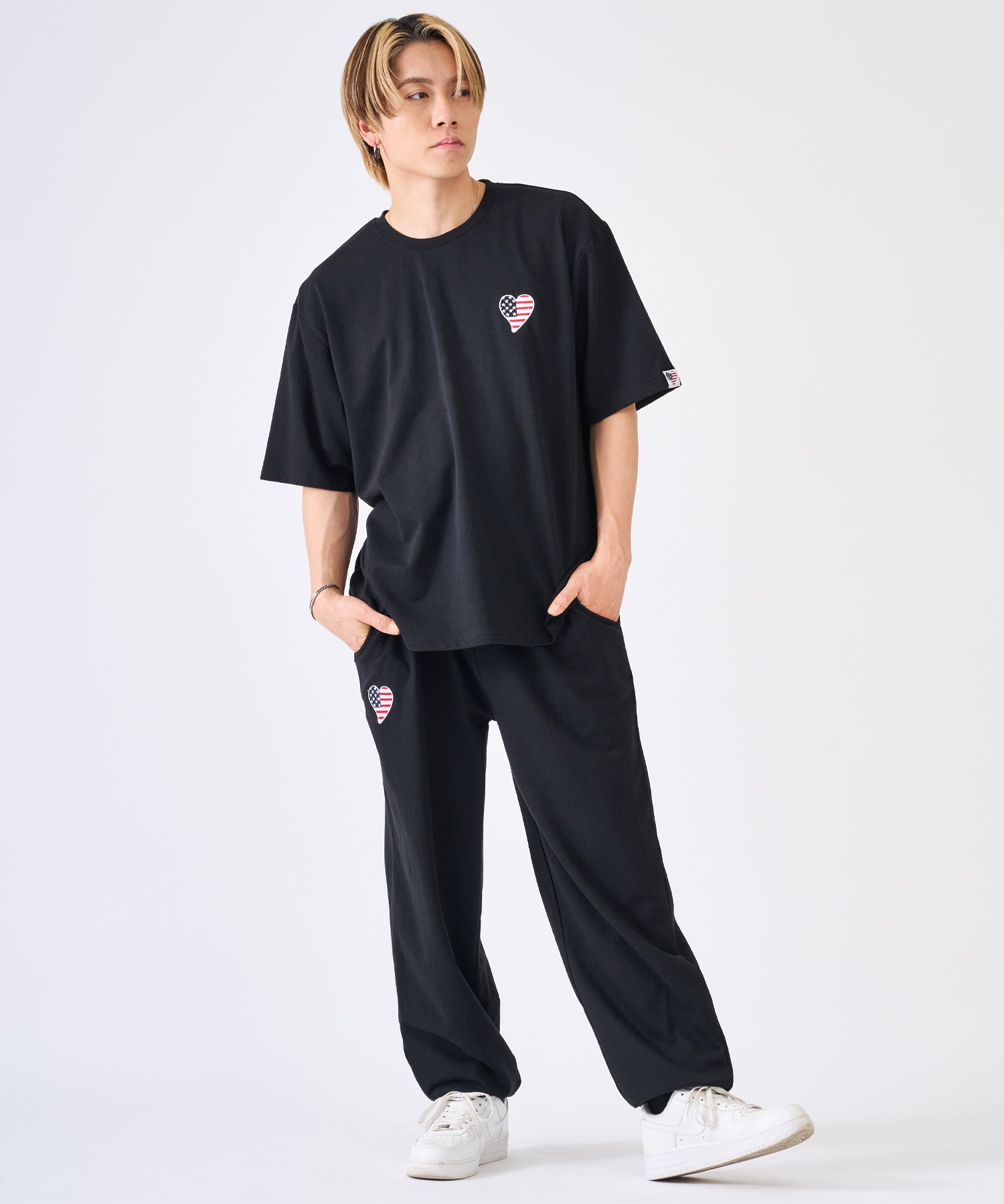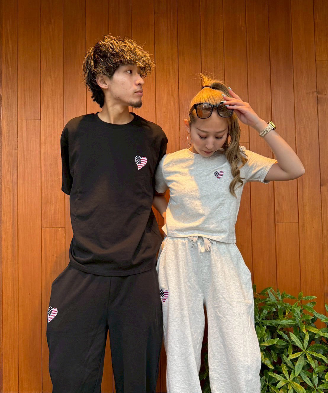 Tシャツの胸とパンツの右サイドにあるワンポイントは星条旗柄に刺繍したハート型❤