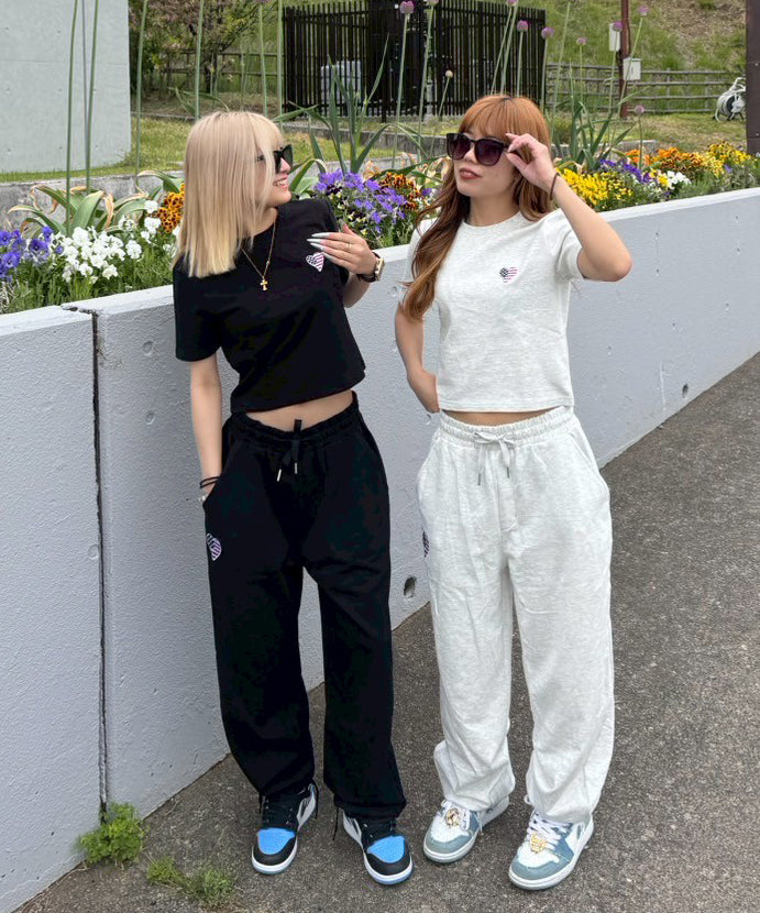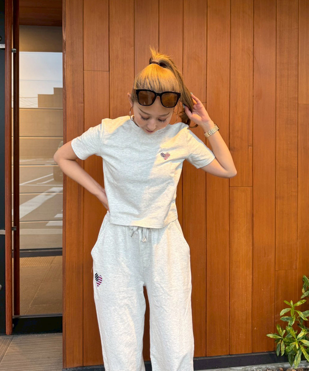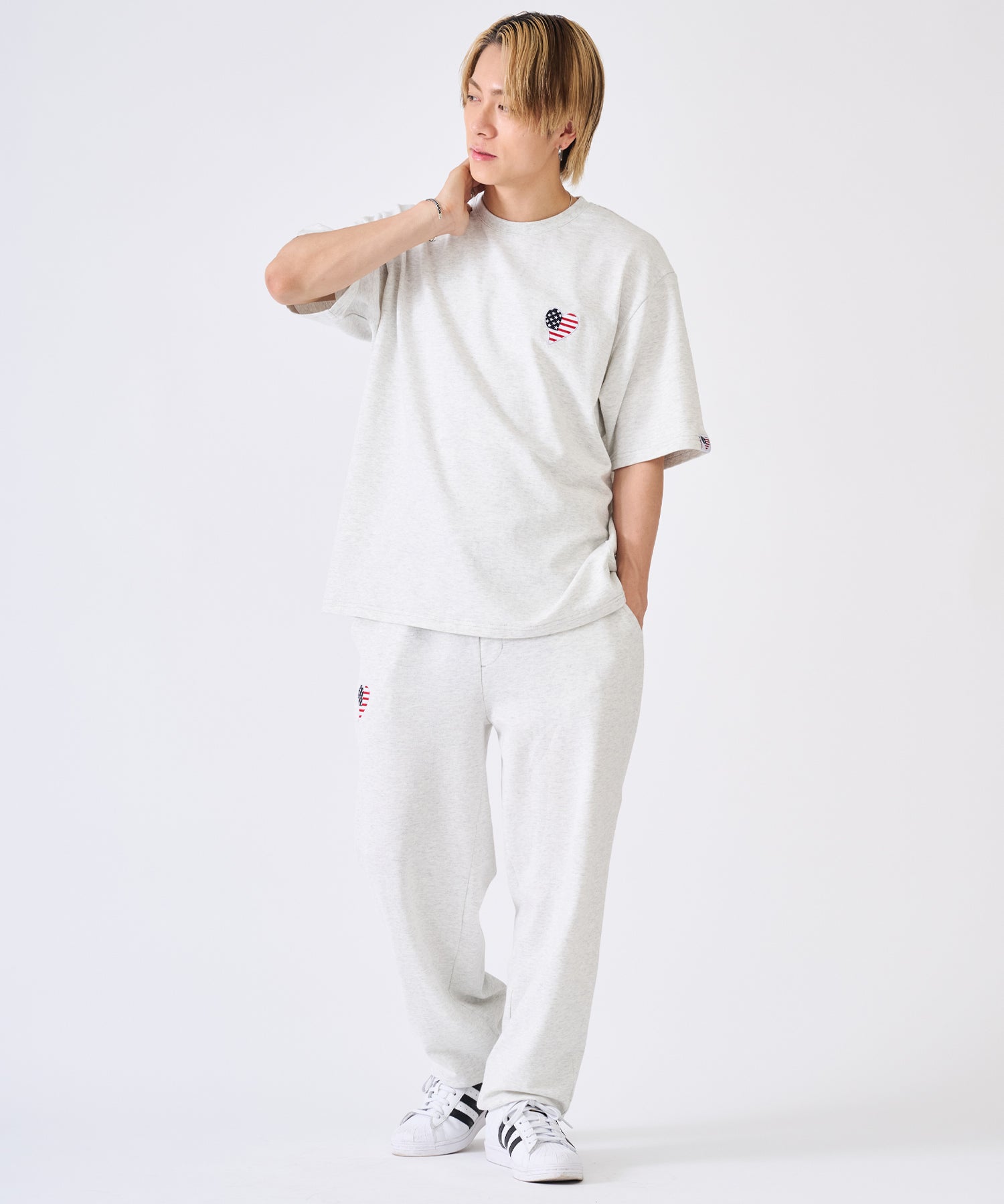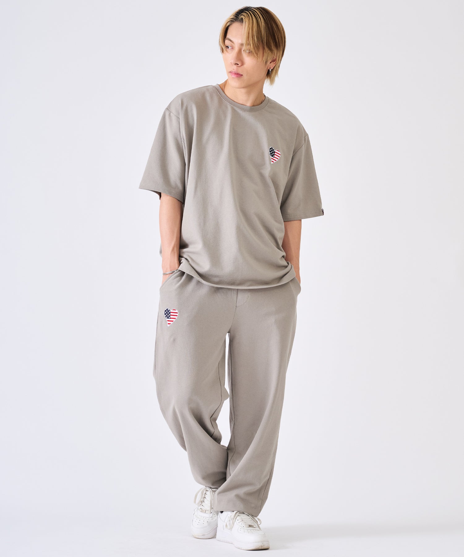 Tシャツの胸とパンツの右サイドにあるワンポイントは星条旗柄に刺繍したハート型❤