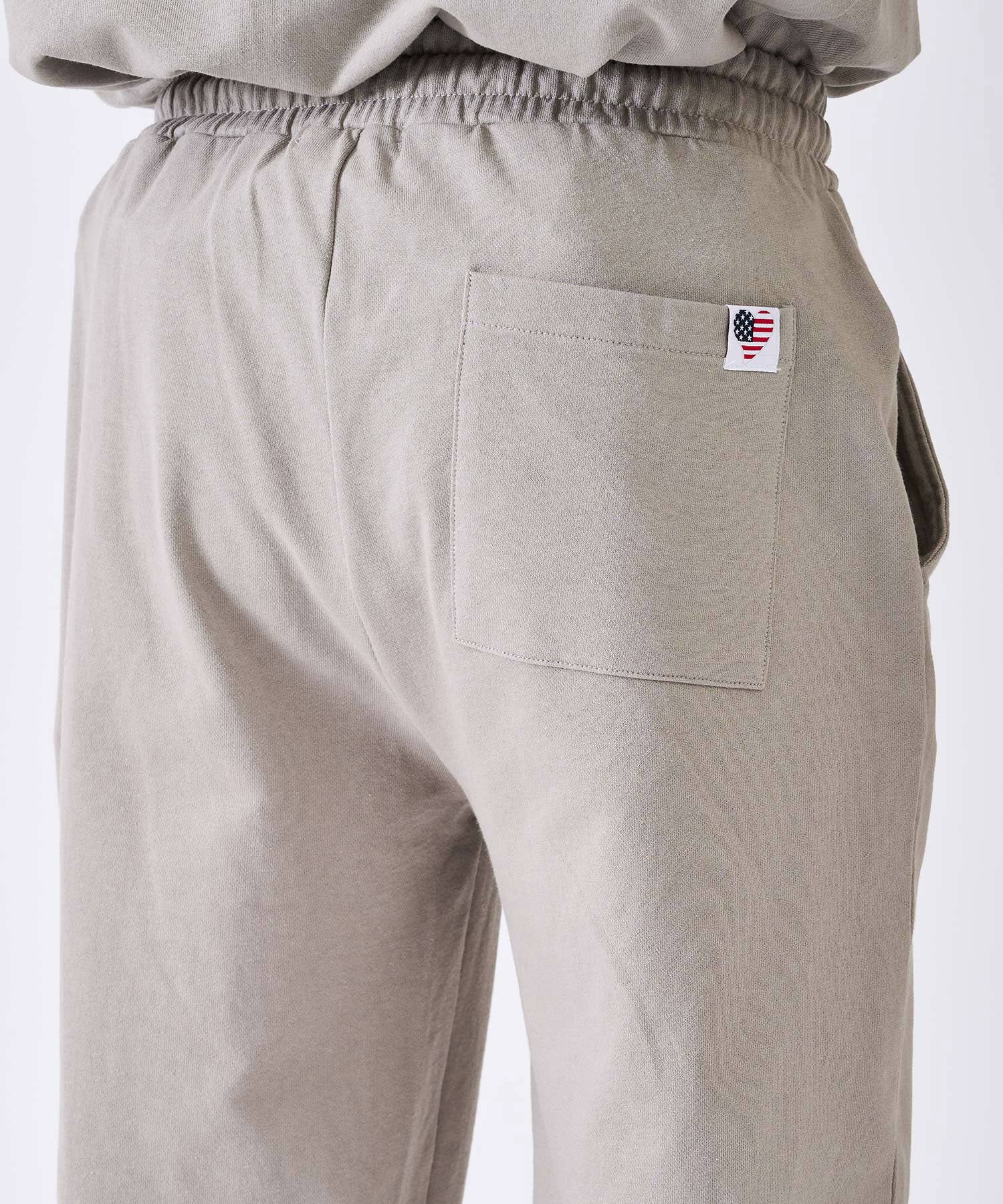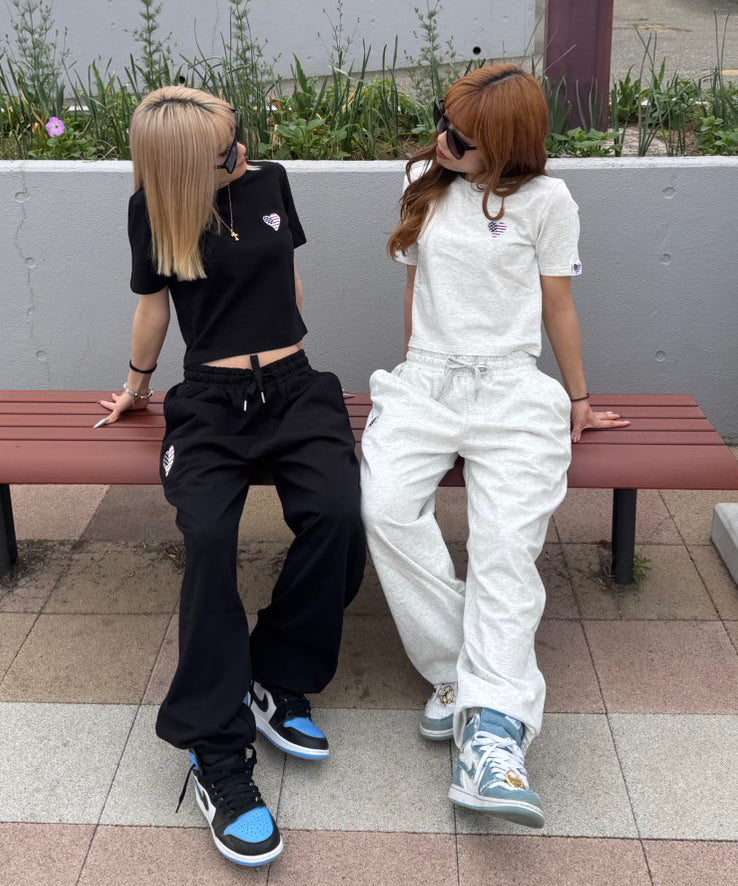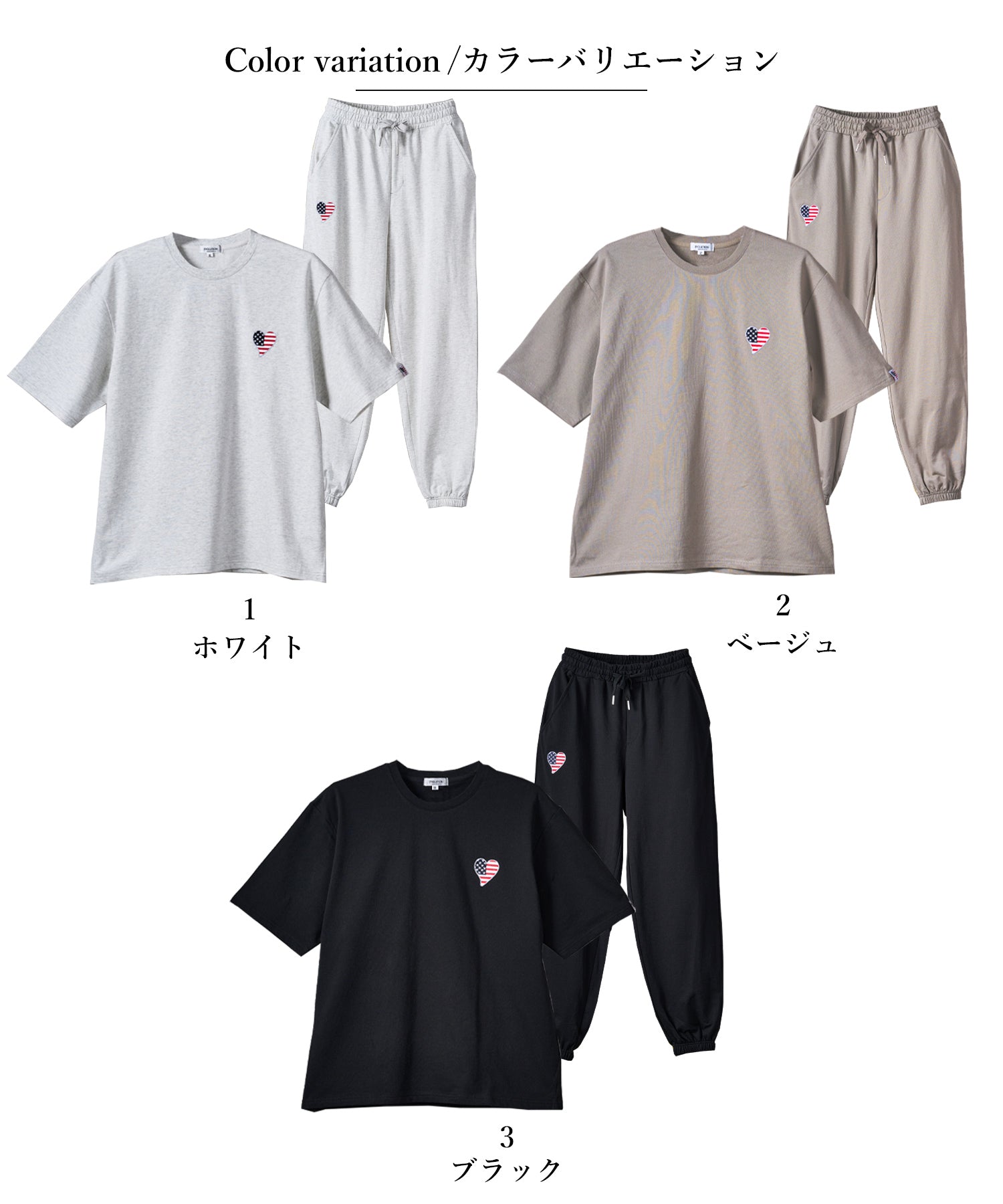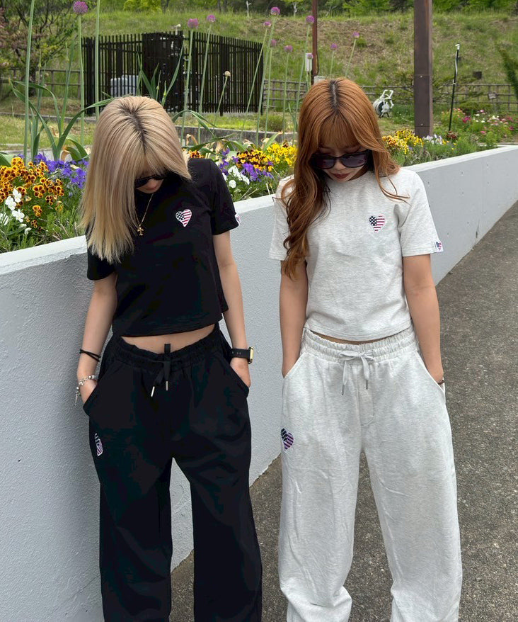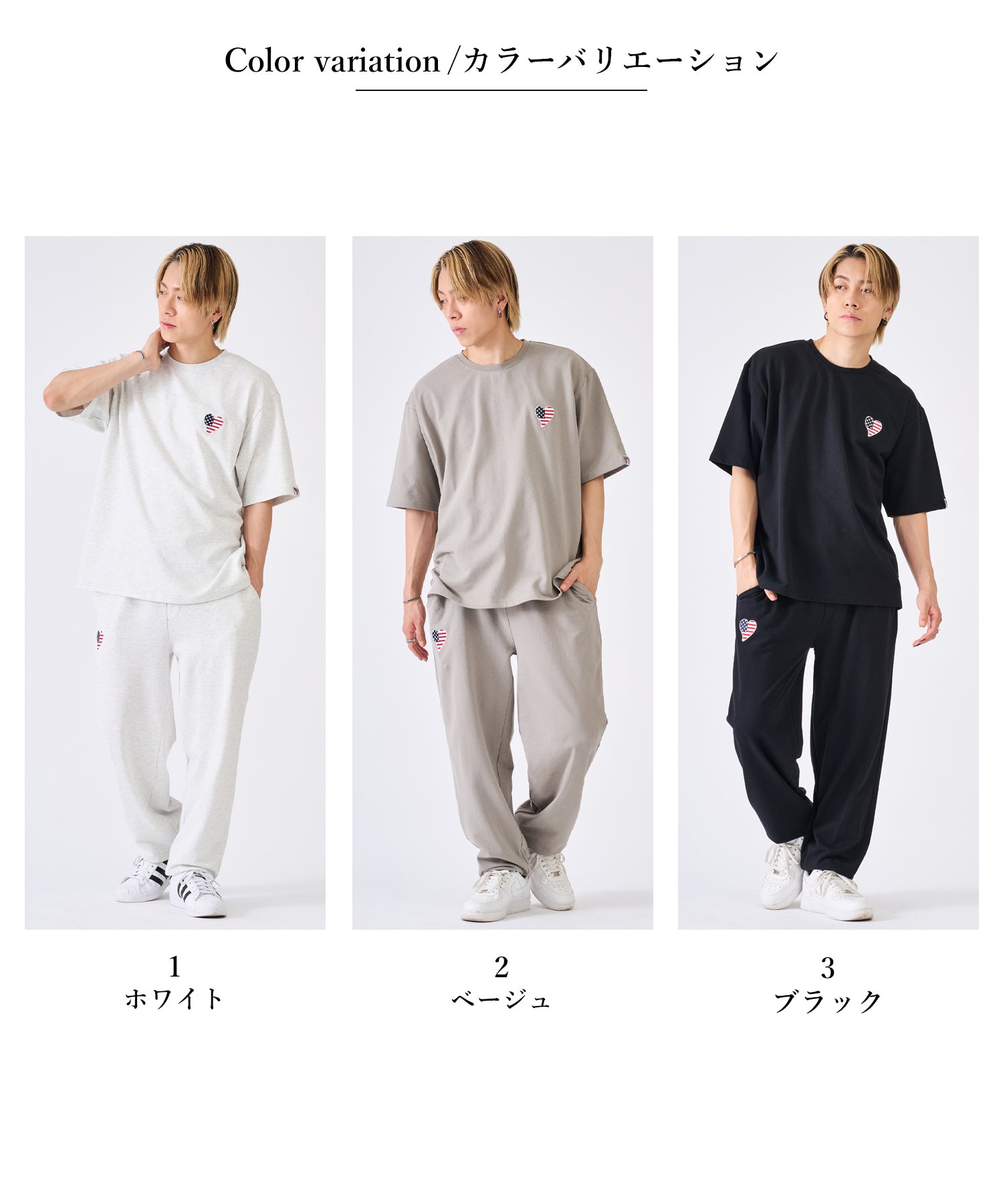 Tシャツの胸とパンツの右サイドにあるワンポイントは星条旗柄に刺繍したハート型❤