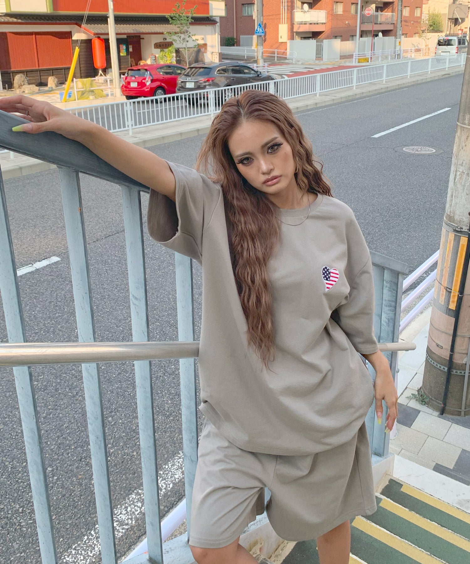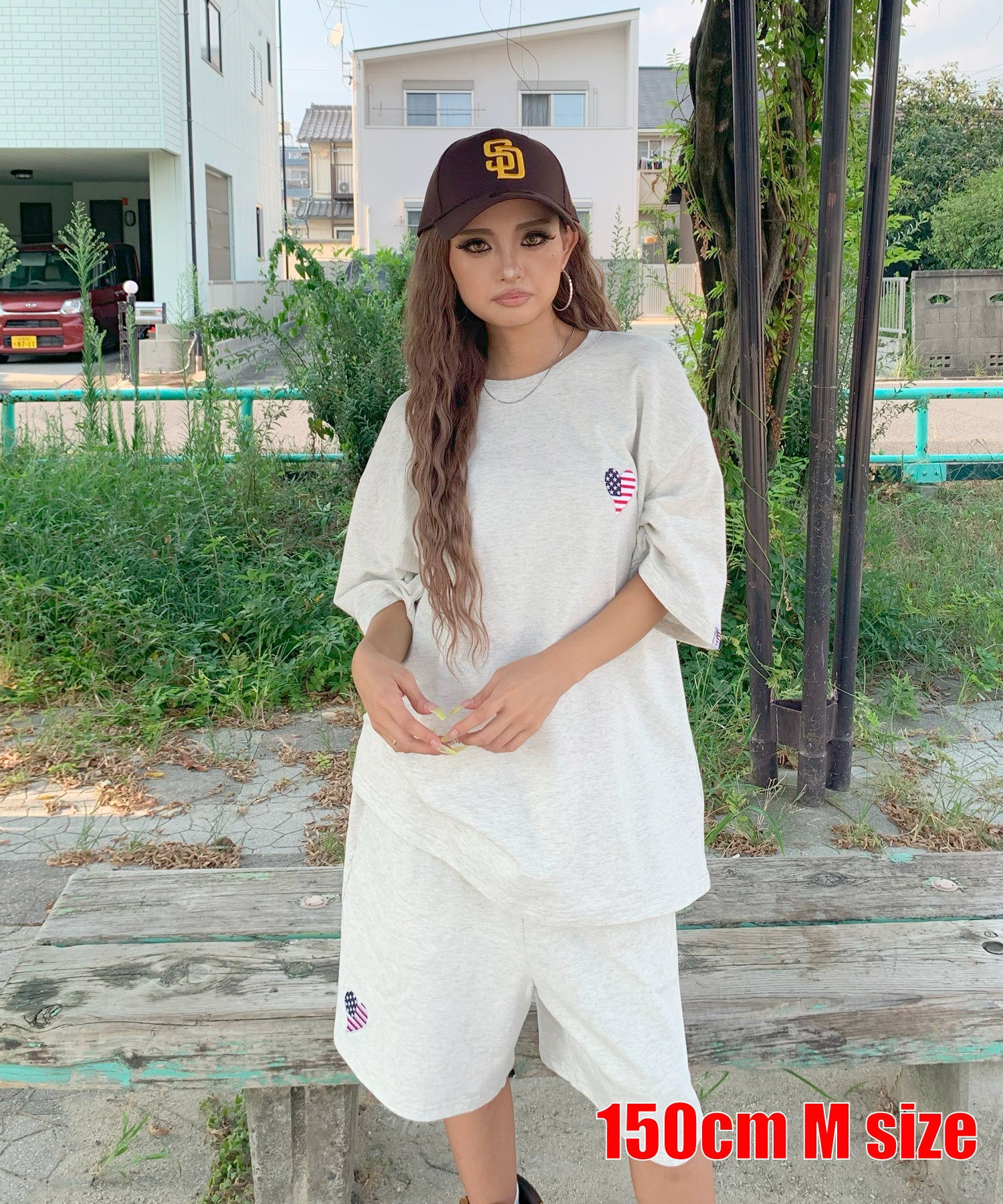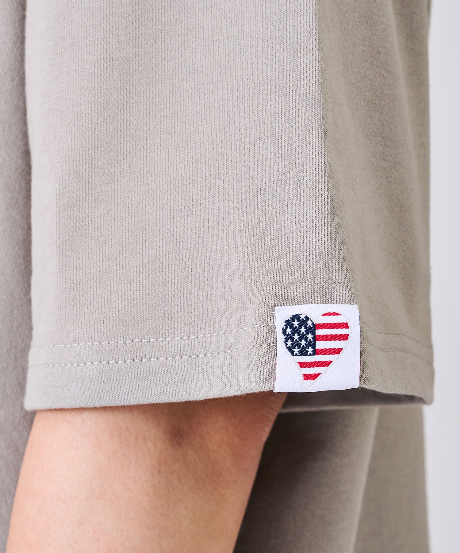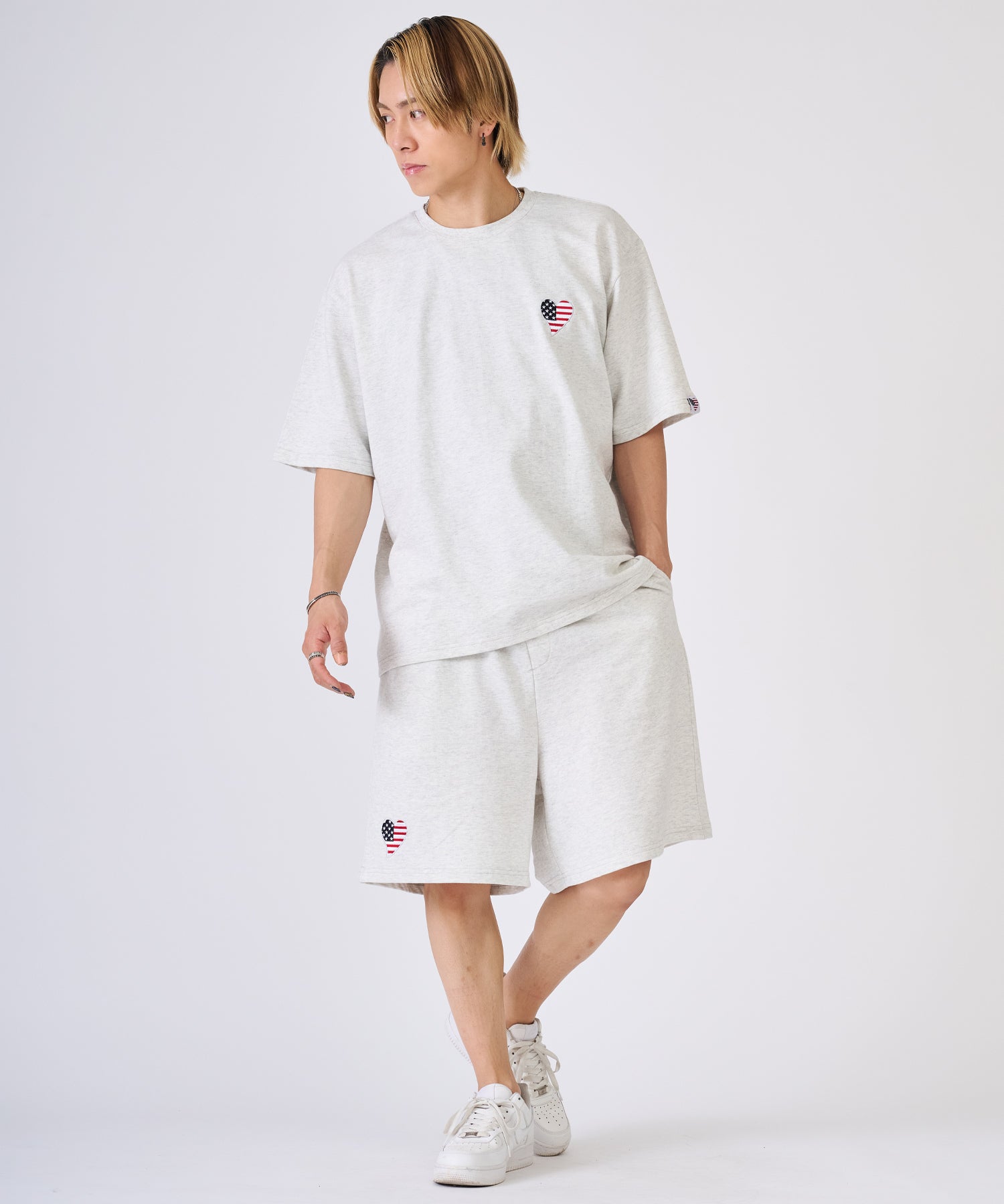 Tシャツの胸とパンツの右サイドにあるワンポイントは星条旗柄に刺繍したハート型❤