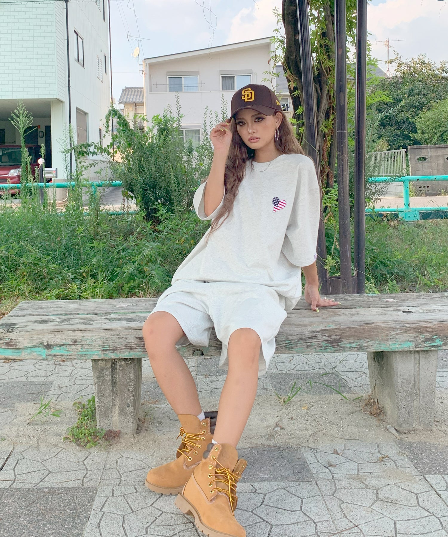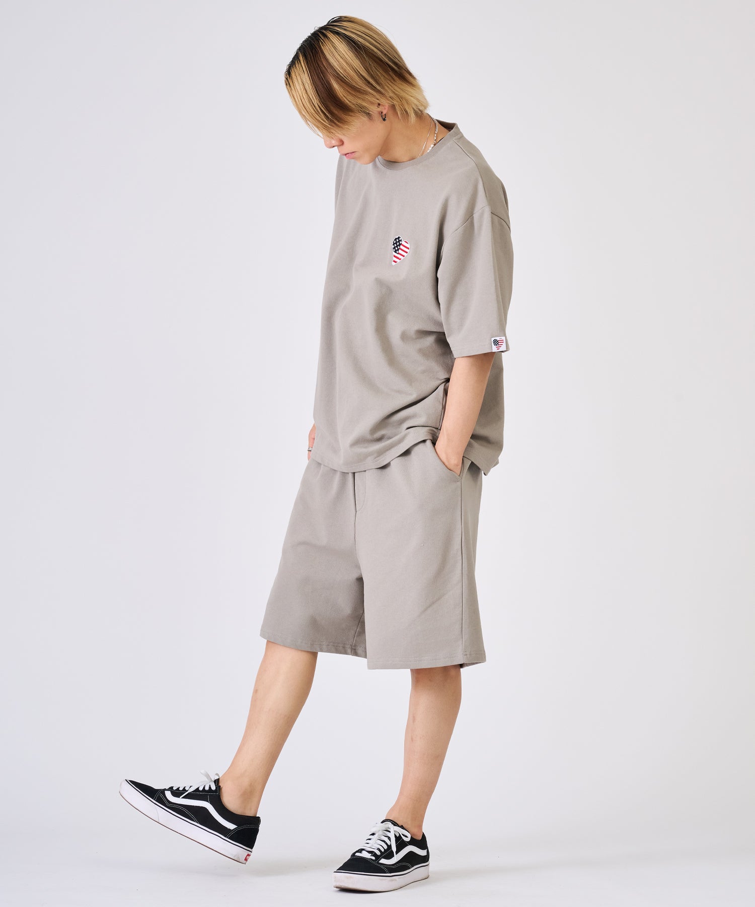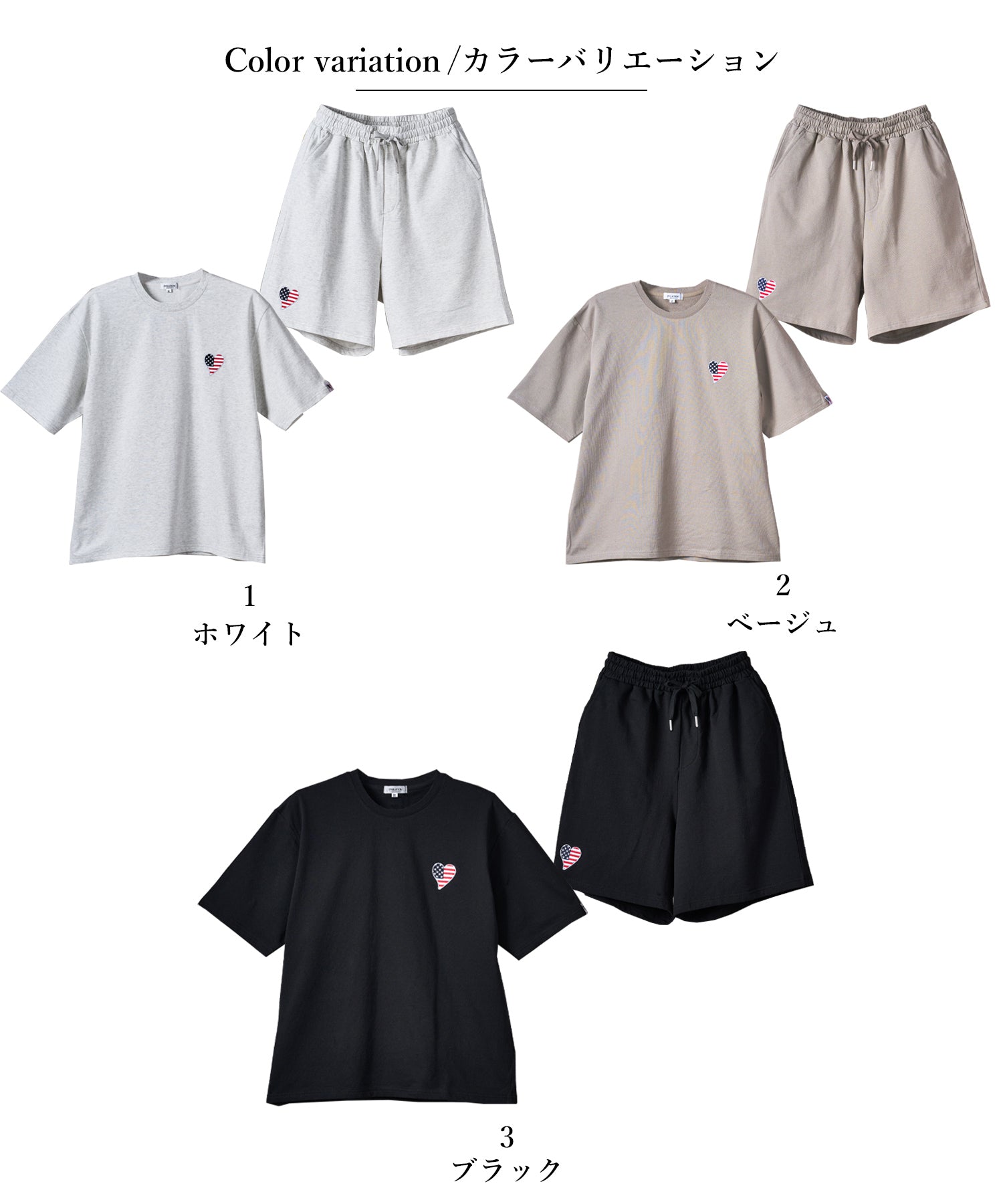 Tシャツの胸とパンツの右サイドにあるワンポイントは星条旗柄に刺繍したハート型❤