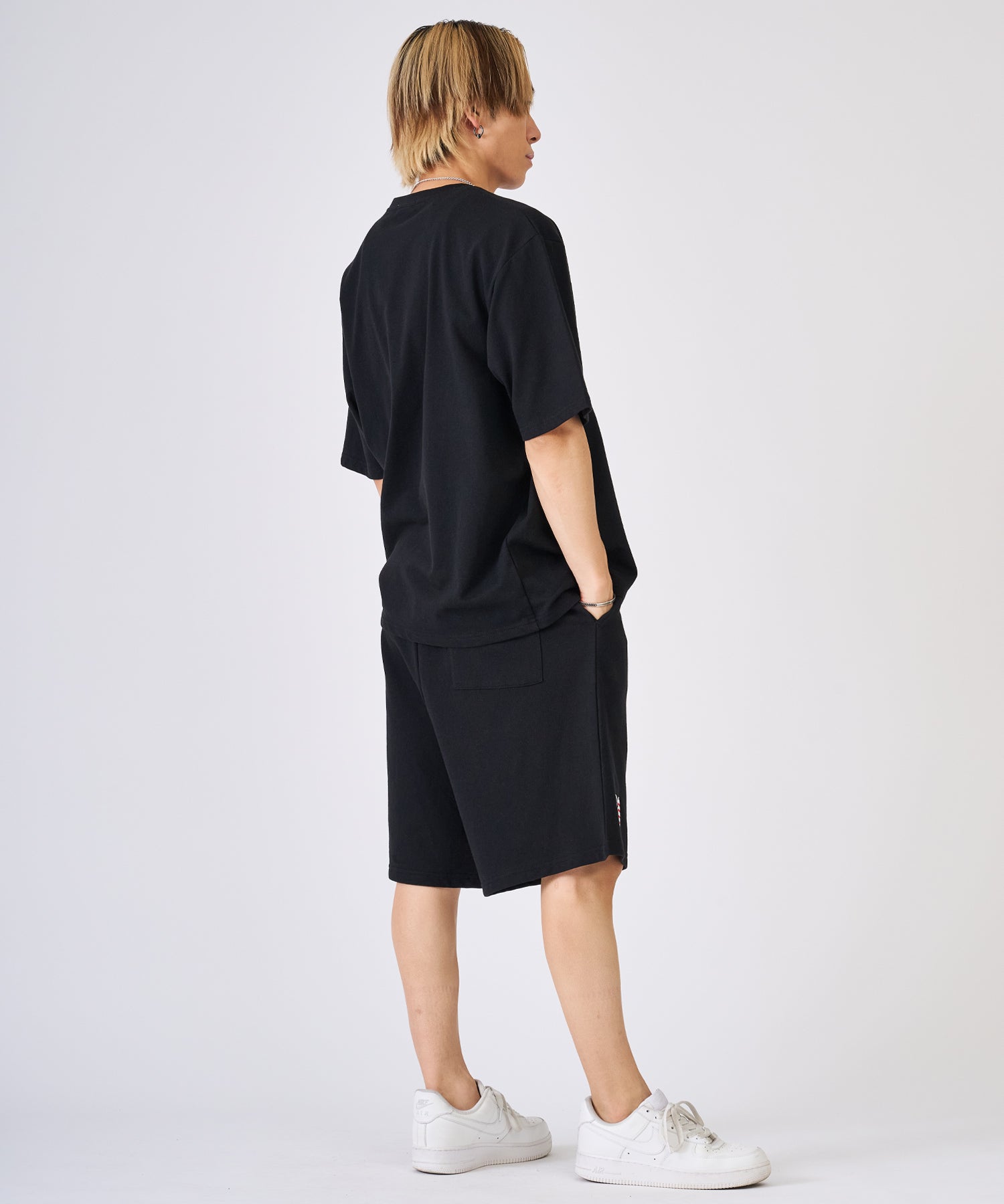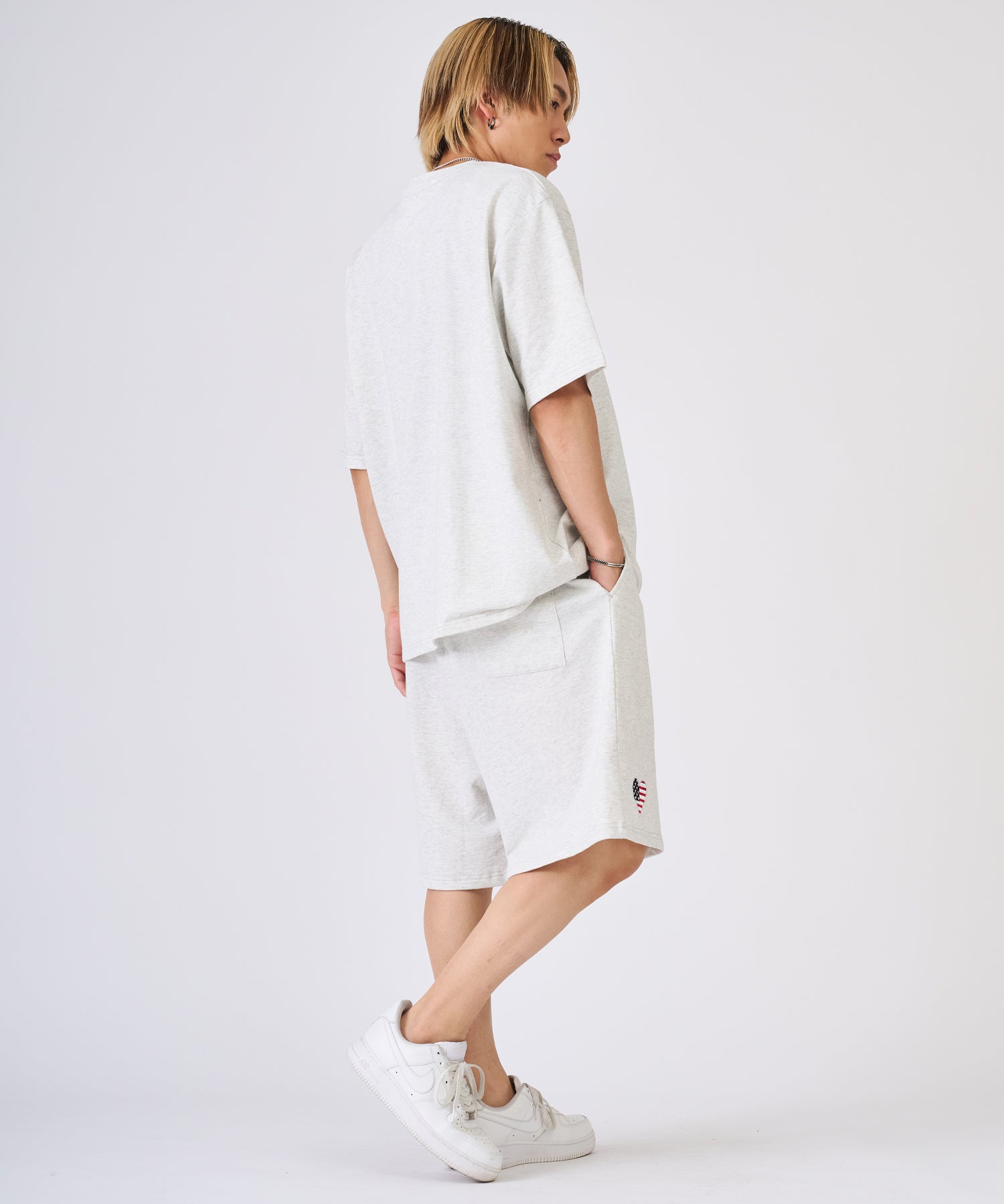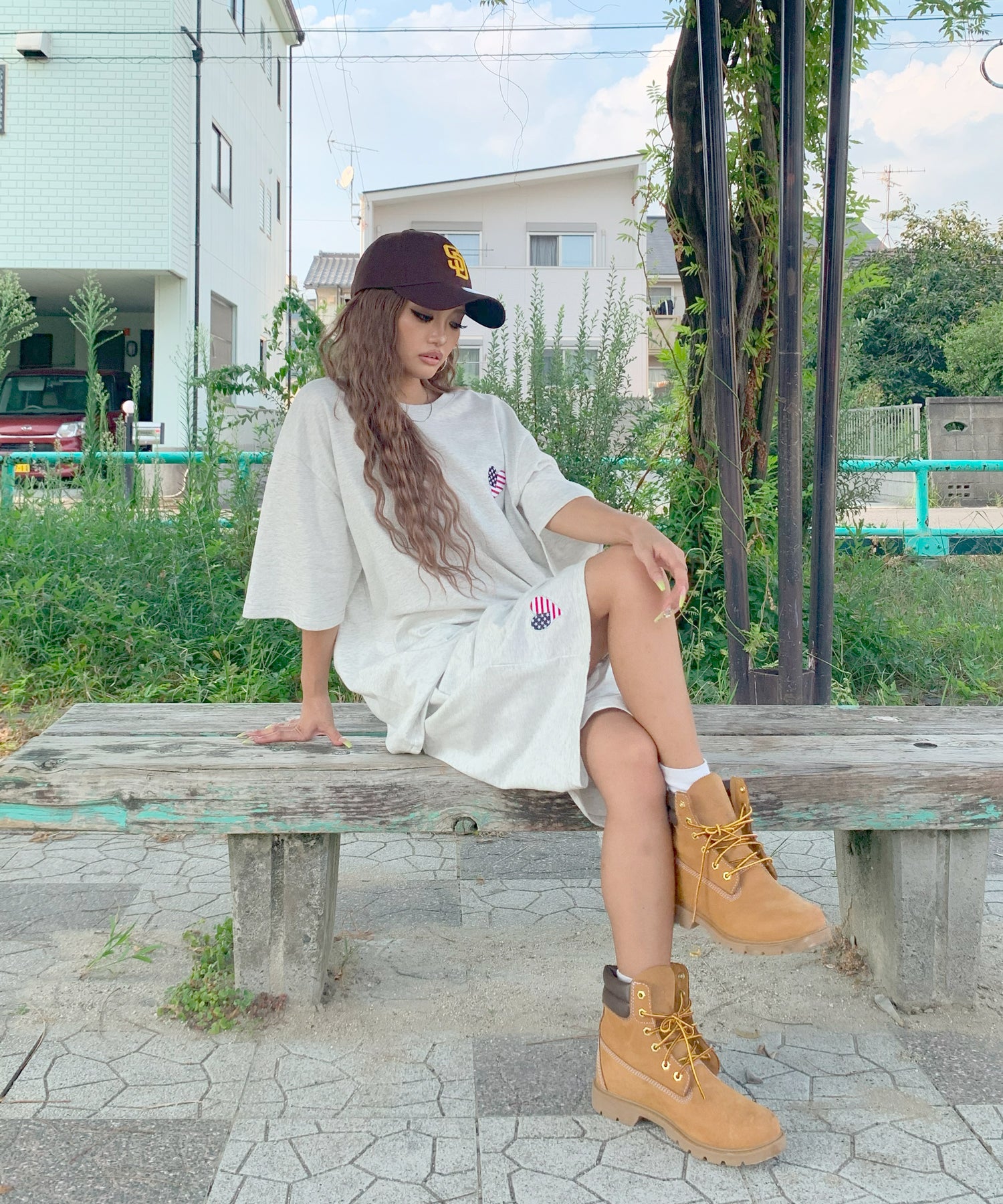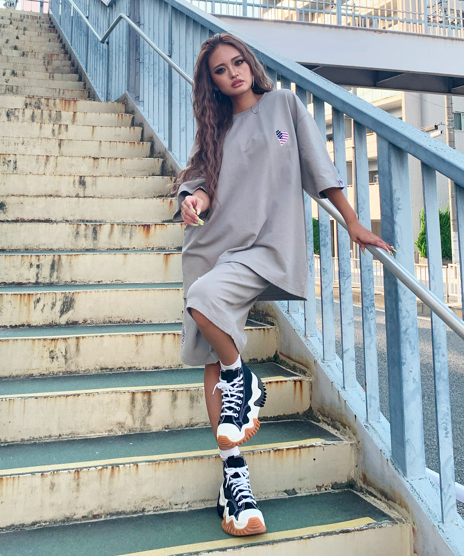Tシャツの胸とパンツの右サイドにあるワンポイントは星条旗柄に刺繍したハート型❤