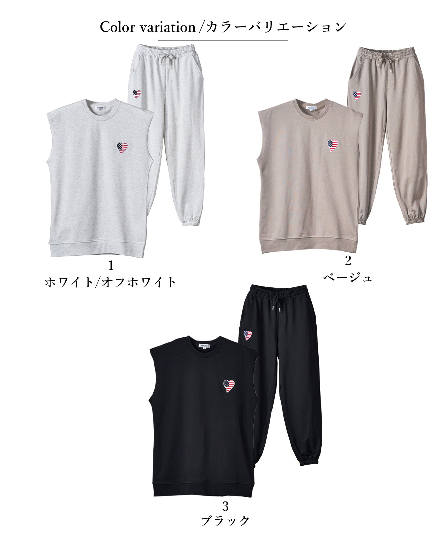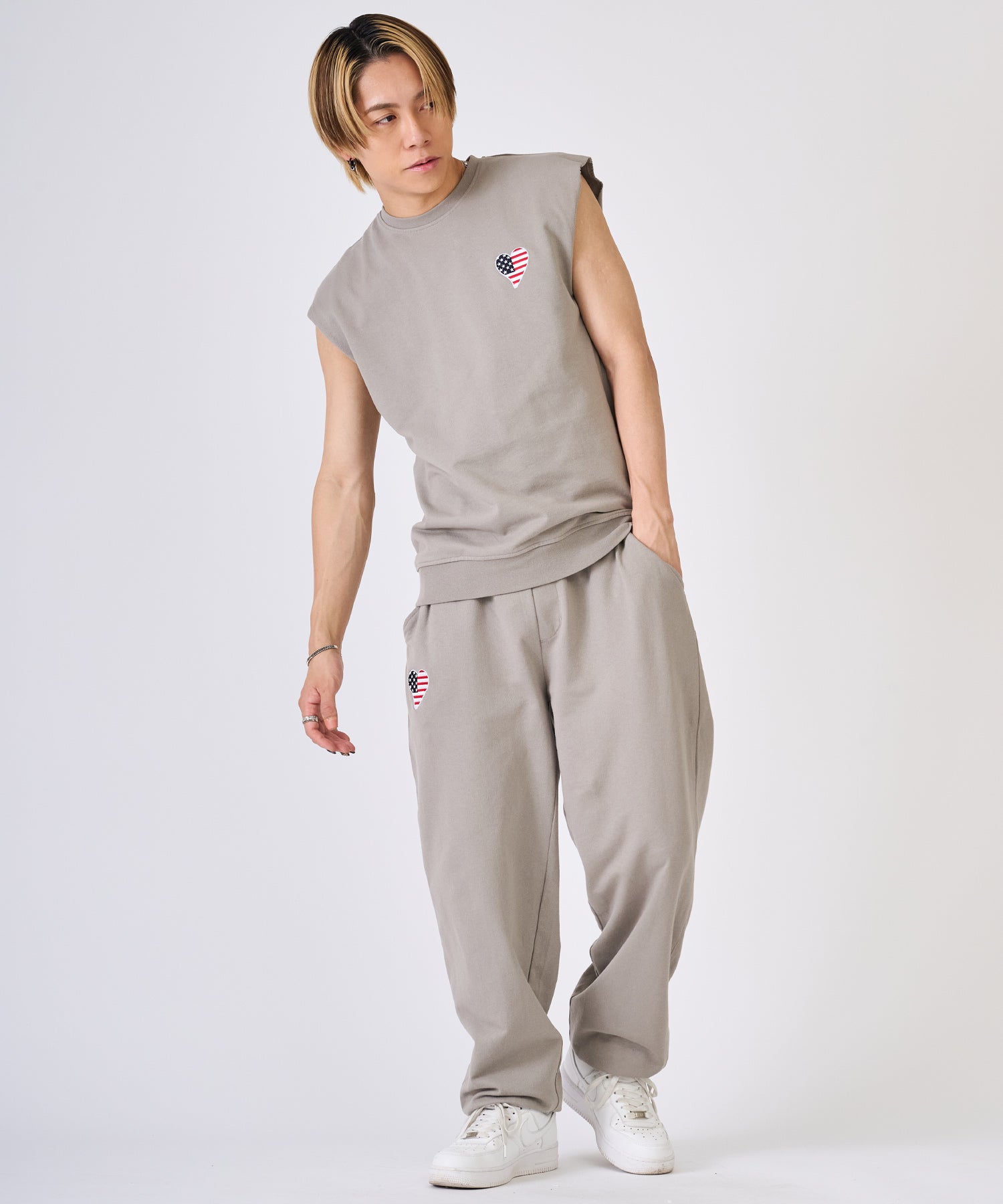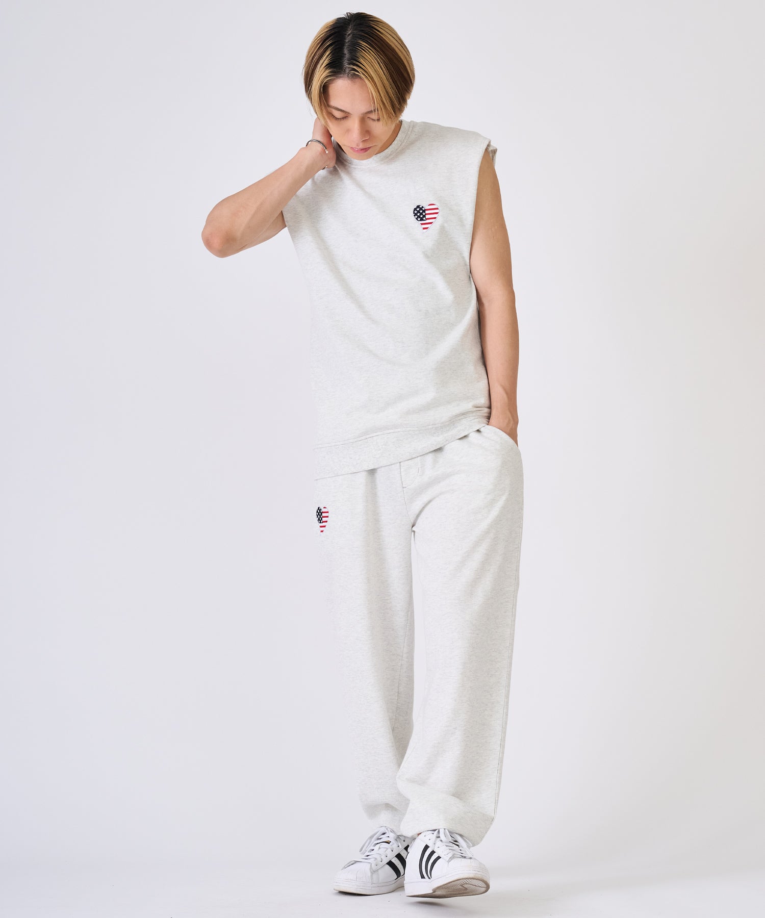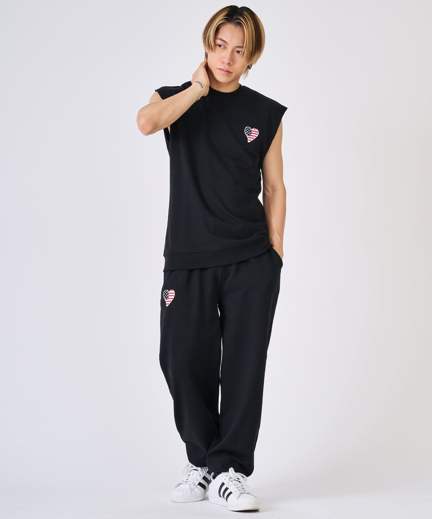 ノースリーブの胸とパンツの右サイドにあるワンポイントは星条旗柄に刺繍したハート型❤