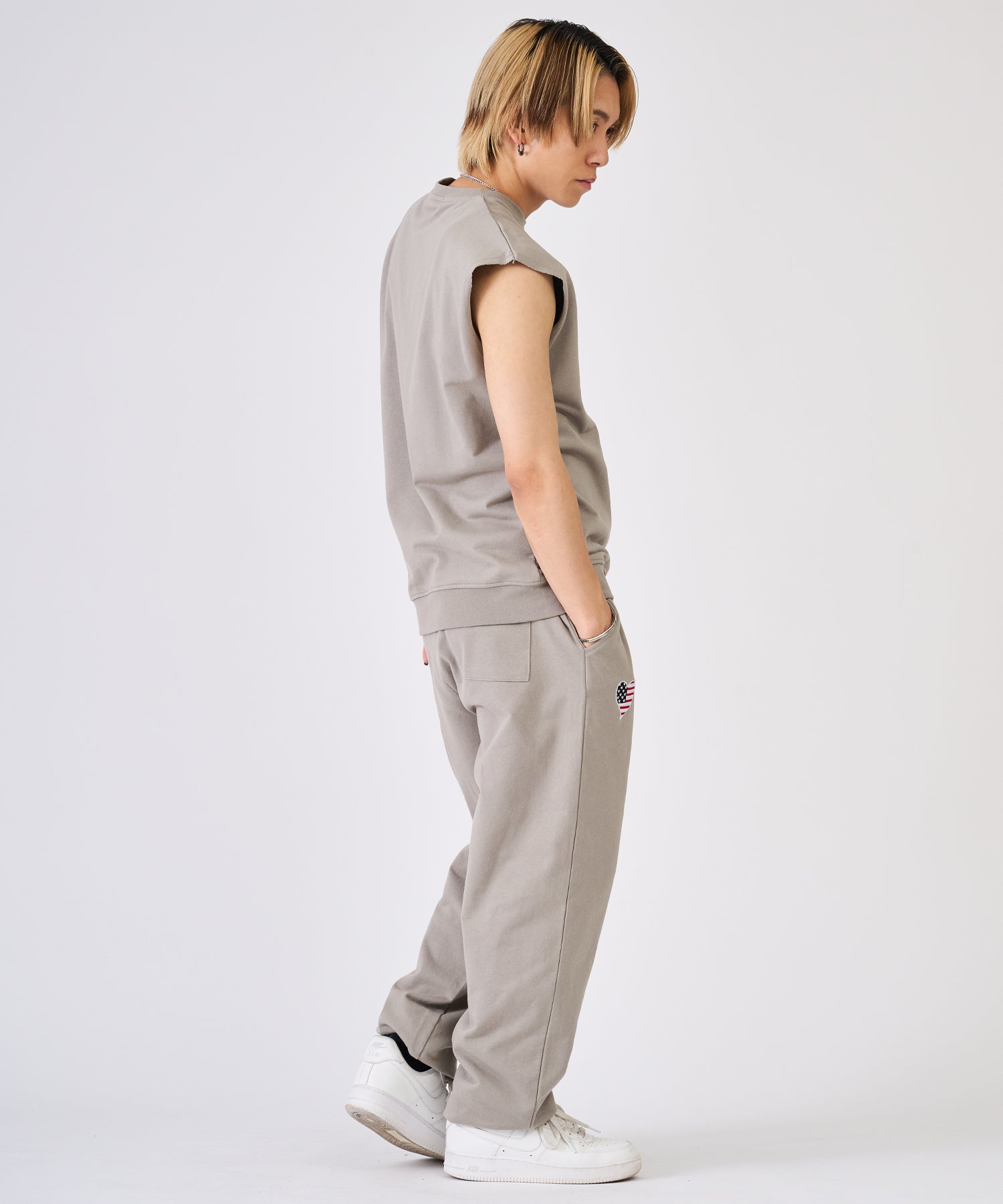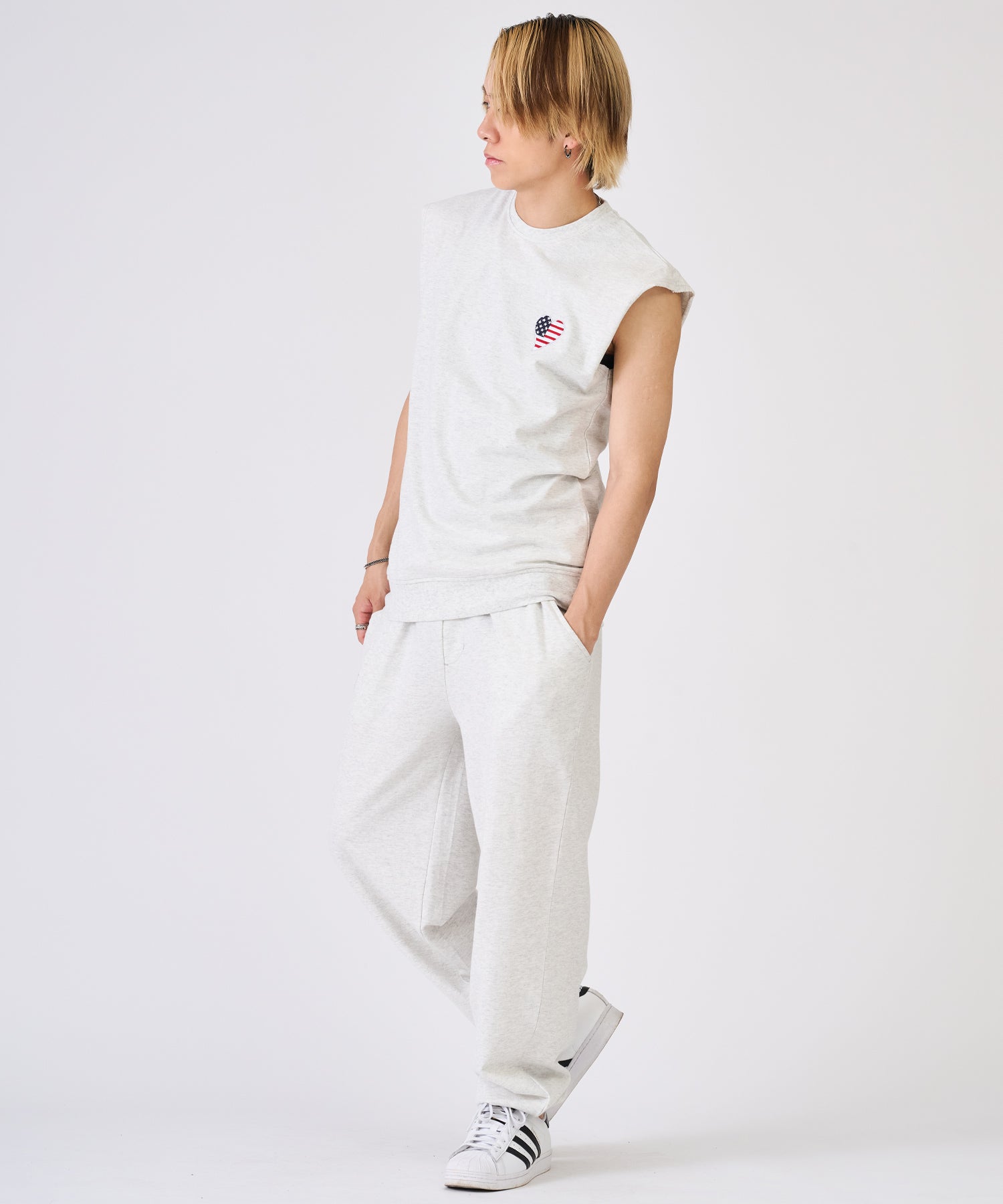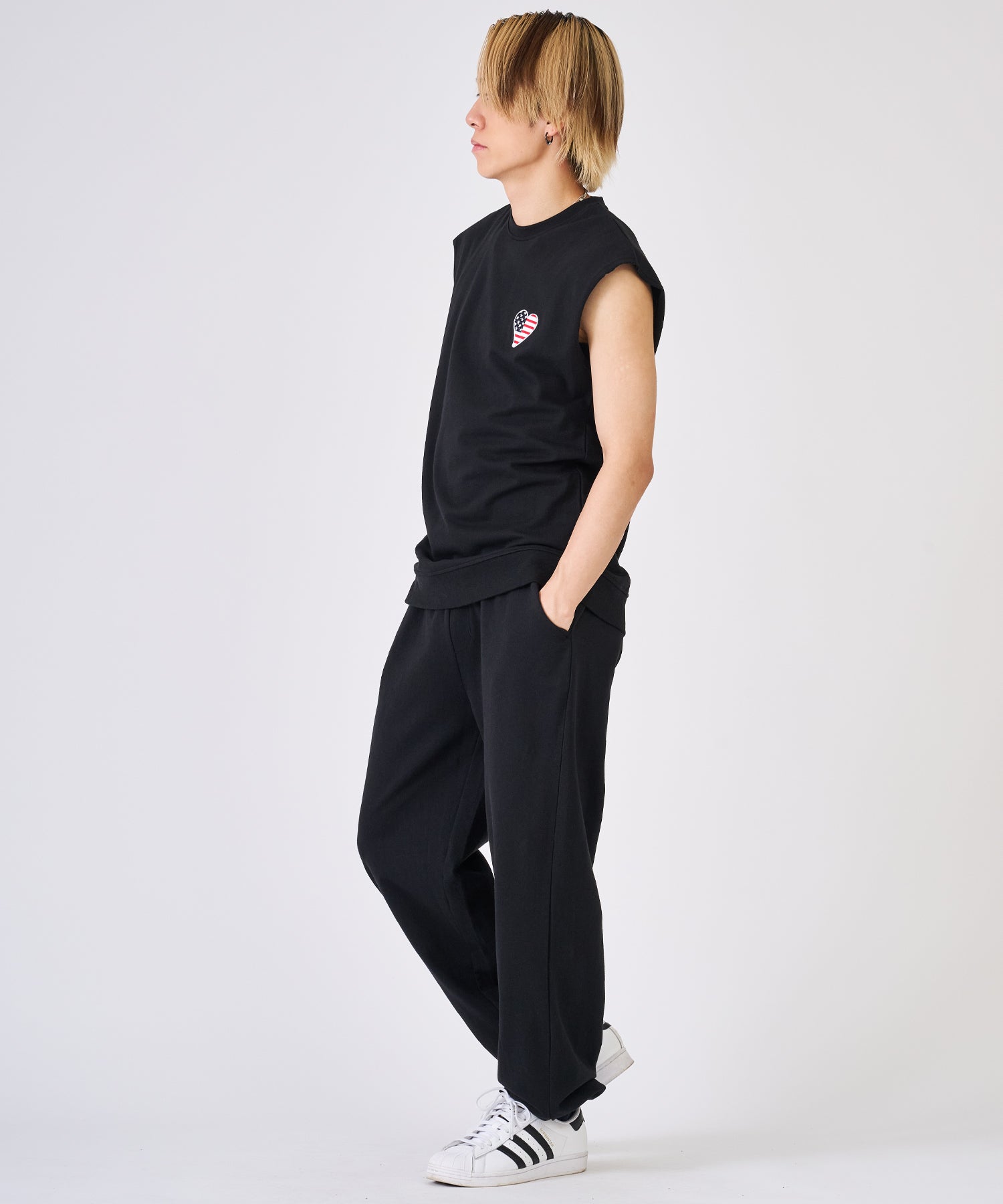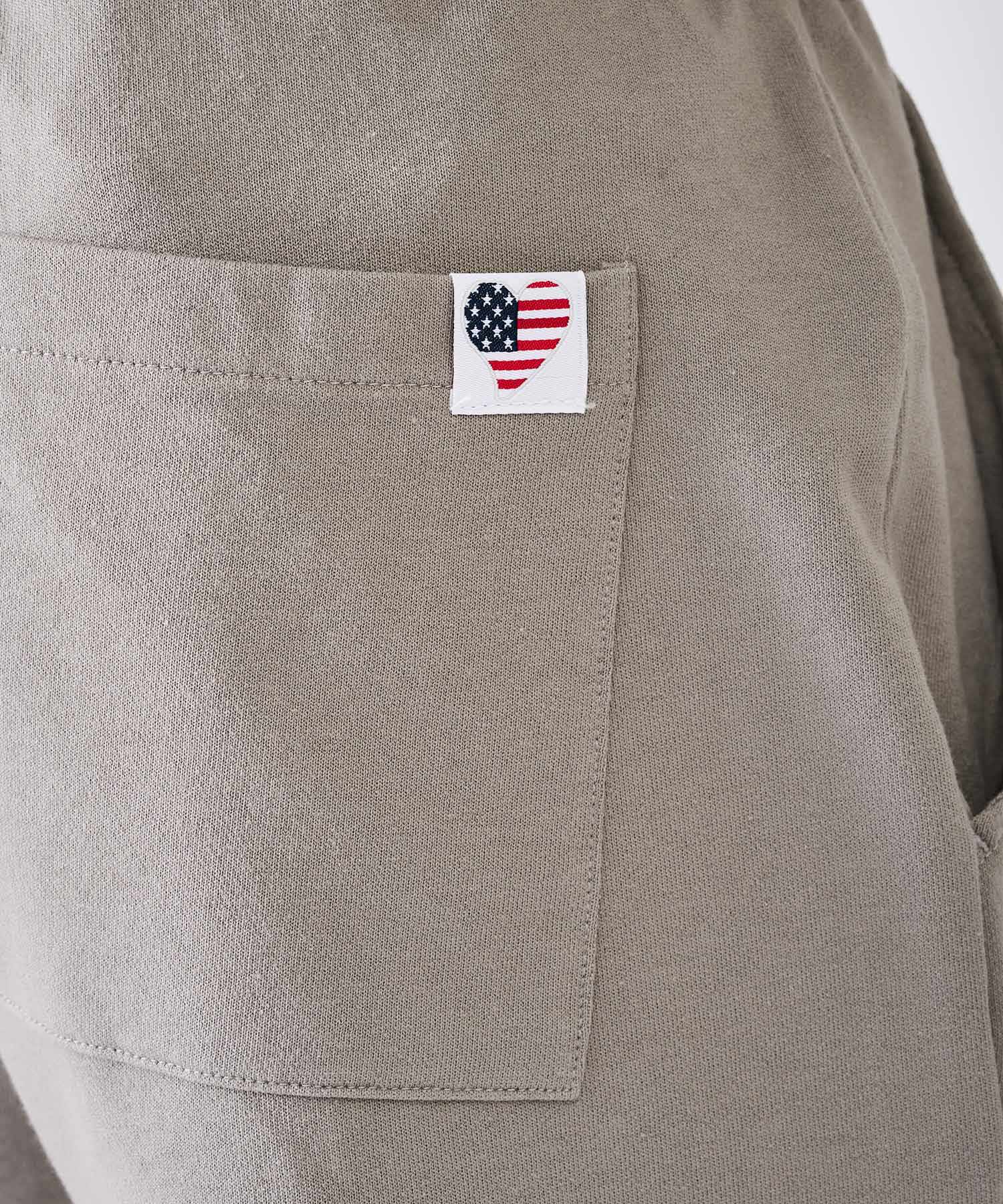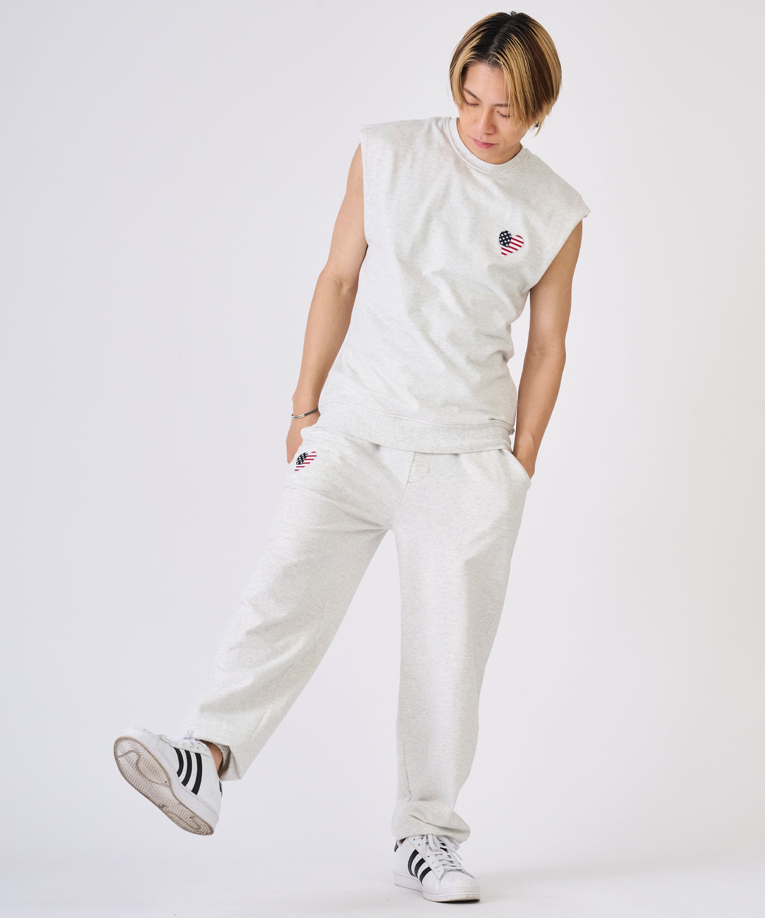 ノースリーブの胸とパンツの右サイドにあるワンポイントは星条旗柄に刺繍したハート型❤